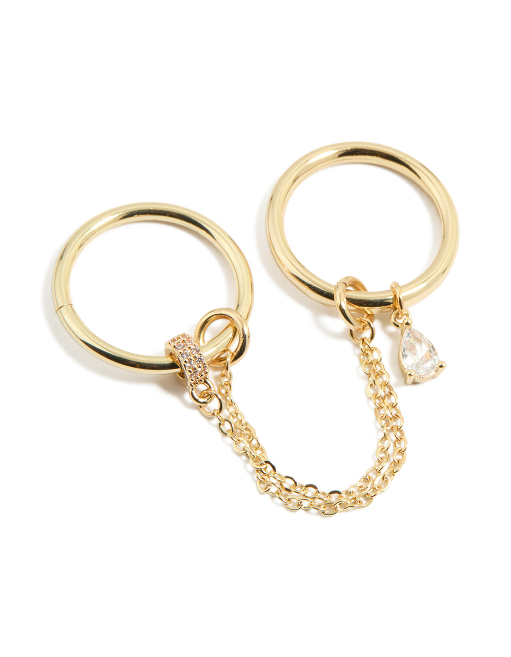 Turn heads with this Gold Plated Cubic Zirconia Pear Drop Chain Ring, the ultimate accessory for effortlessly cool style. Featuring a chic chain that links the two smooth rings together, this ring is perfect for creating a stylish stacked look. The gold finish and dazzling pear-shaped cubic zirconia crystal detailing adds a touch of glamour to your everyday or party outfits. Pair it with casual denim for a bold statement or dress it up with your favourite evening wear. Whether you're heading to brunch or a night out, this linked ring design ensures you'll stand out with modern elegance.