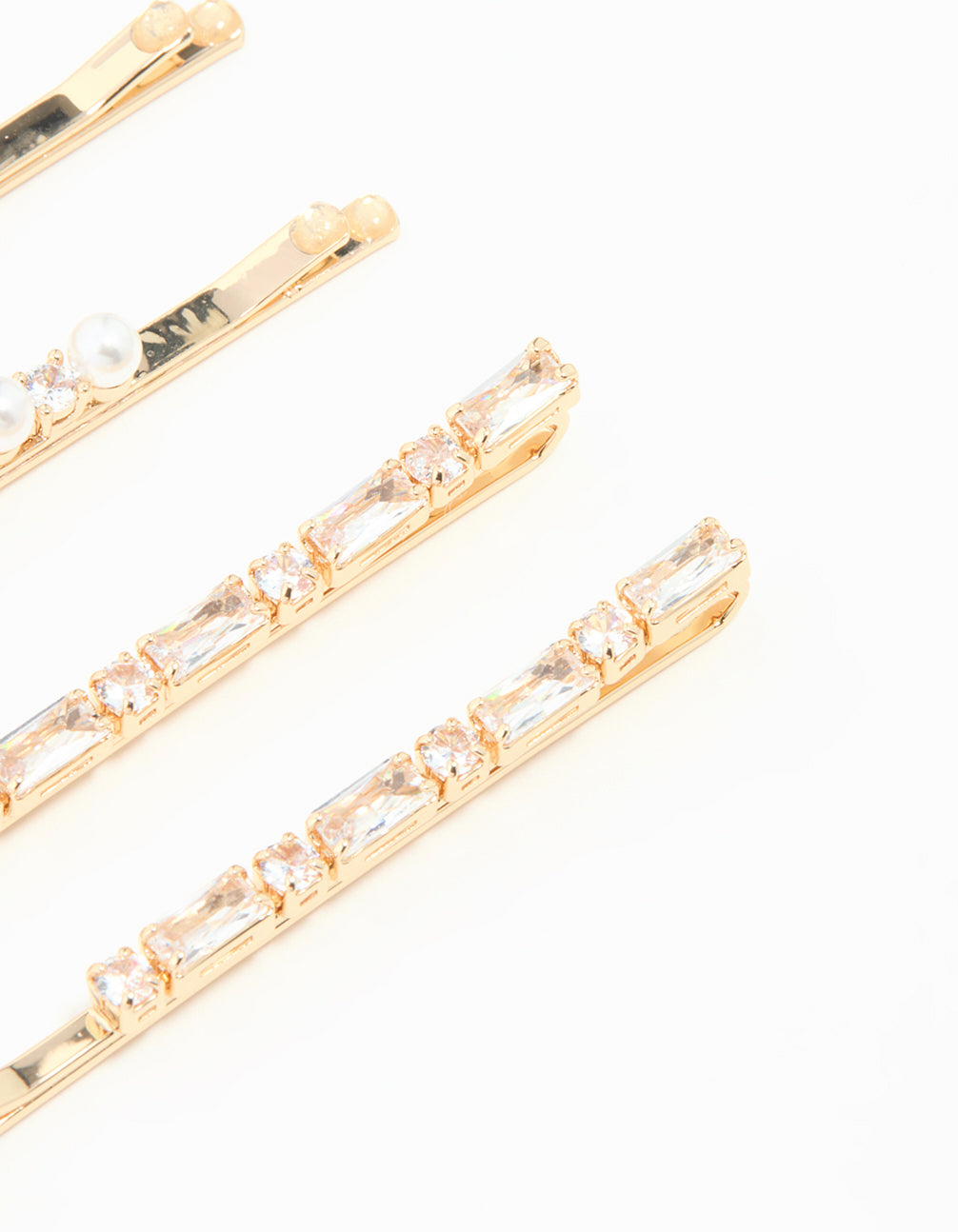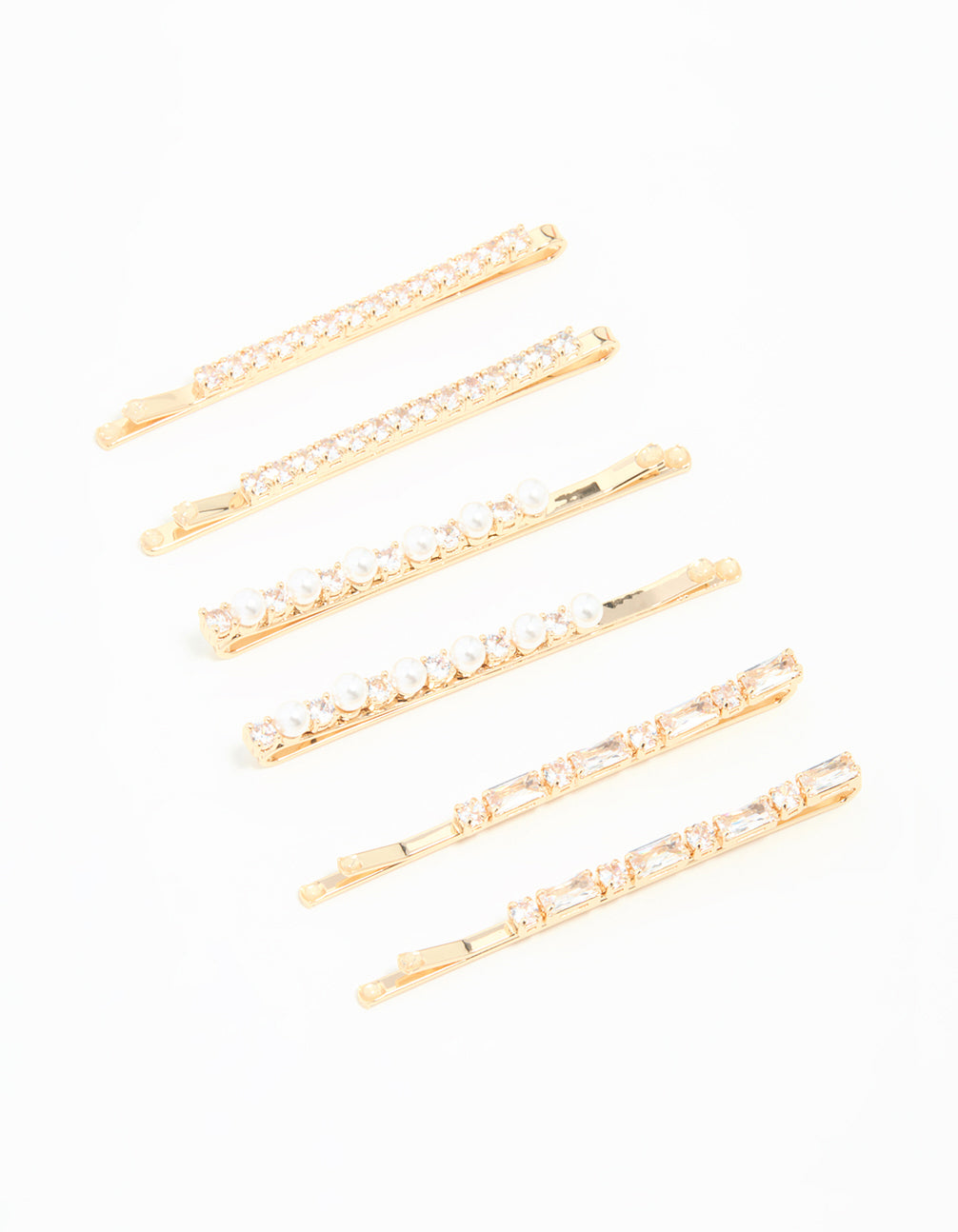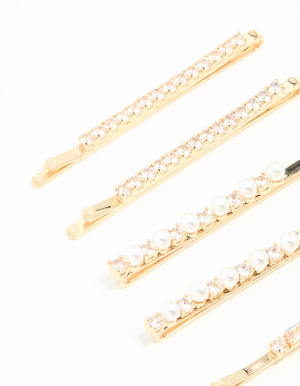 Gold Cubic Zirconia & Pearl Hair Clips 6-Pack