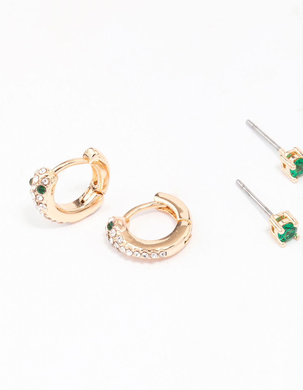 For a timeless addition to your stack, style these gold-toned earrings. This earring pack includes three sets of earrings, including two pairs of emerald-encrusted huggie hoops and a set of adorning stud earrings.