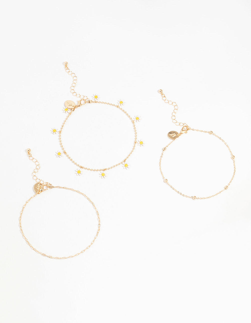 Step up your accessory game with this anklet pack! Featuring three delightful anklets with daisy charms, gold-toned droplets, and mixed chains, they're perfect for summer festivals, beach outings, or casual day trips. Mix and match for endless fun.