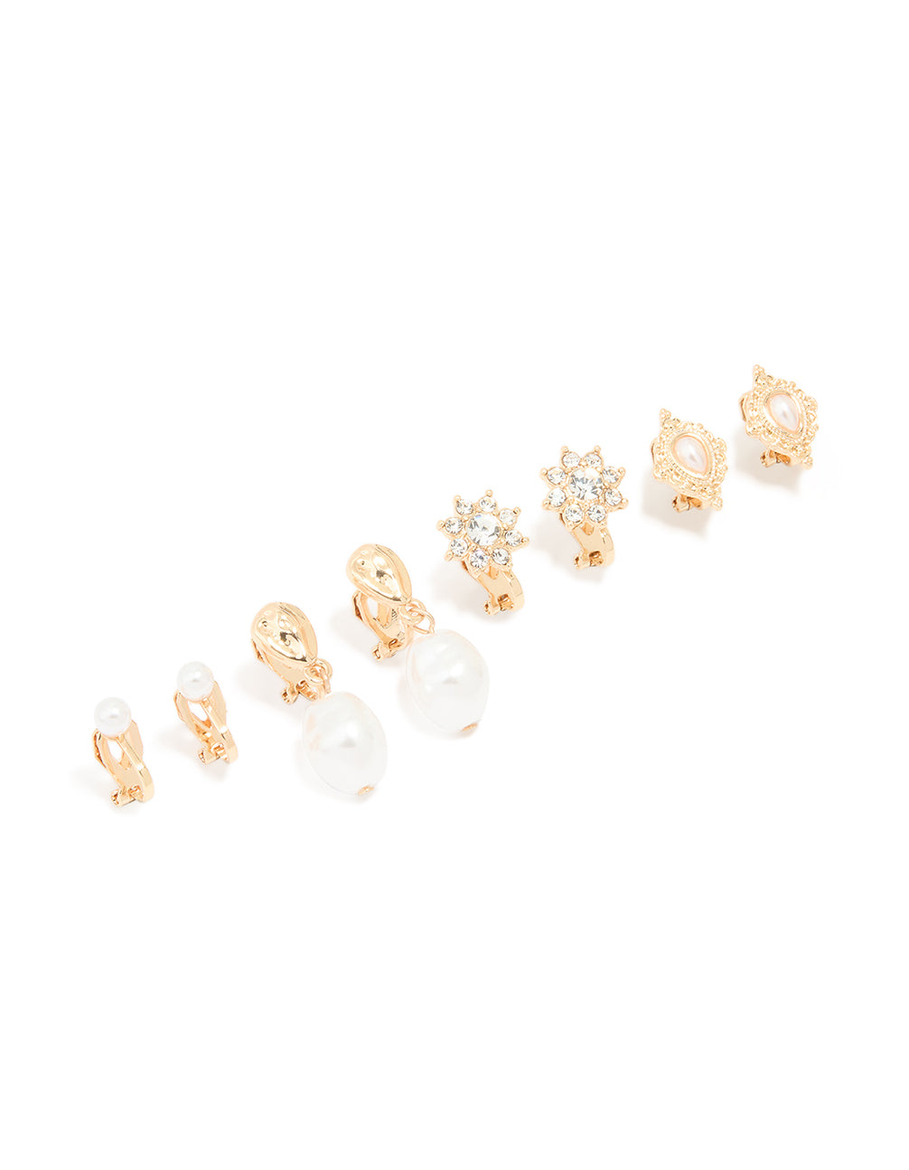 Gold Diamante & Pearl Clip-On Earrings 4-Pack