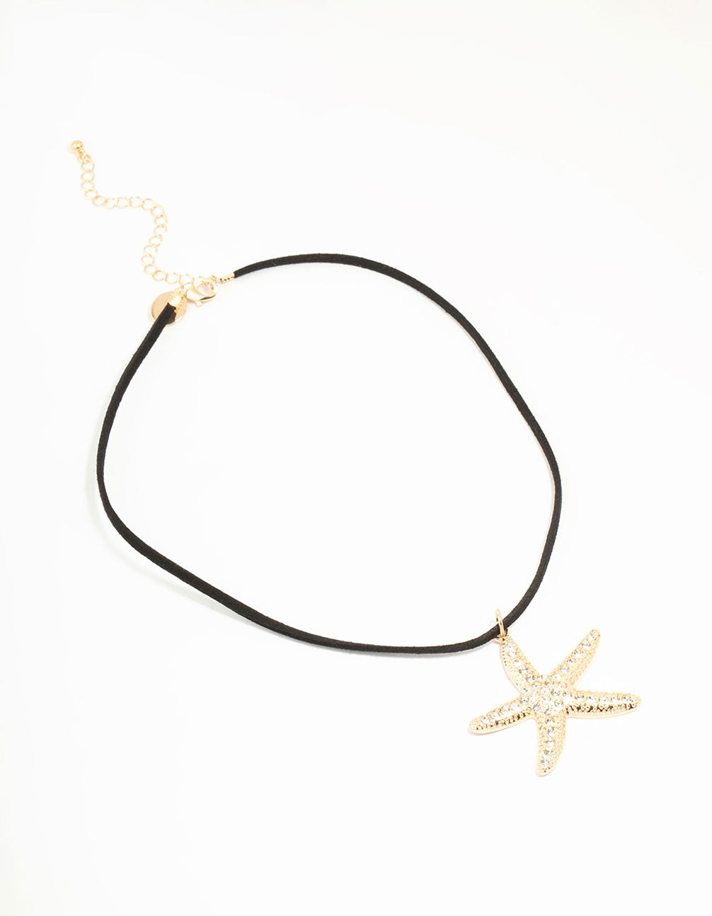 Embrace an ocean-inspired style with this Gold Diamante Starfish Cord Necklace. This stunning piece features a shimmering starfish pendant with sparkling diamantes and a cord base. It's the perfect accessory for both beach-chic and evening looks.
