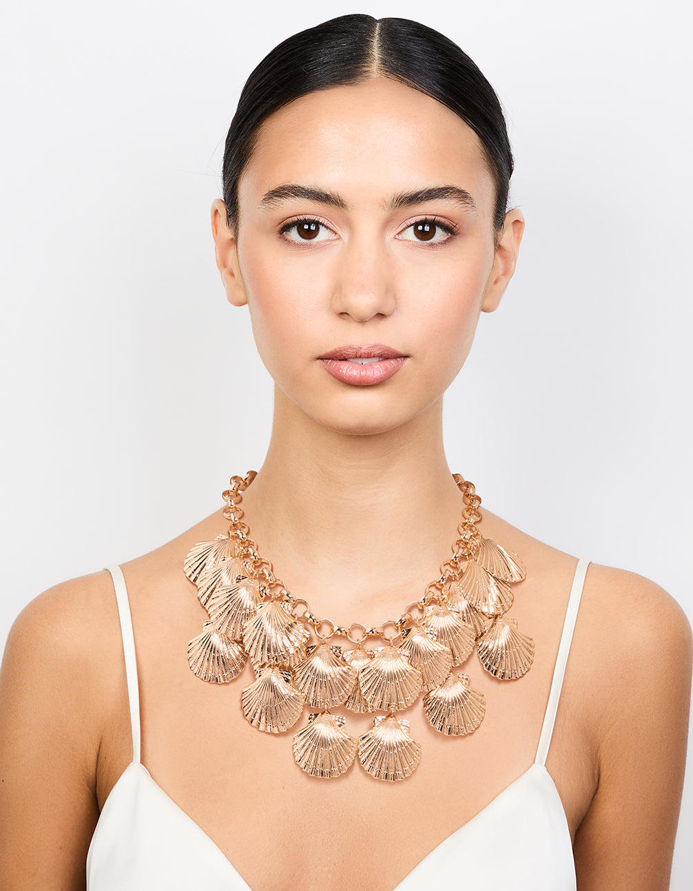 Turn heads with this Gold Shell Statement Necklace. This bold statement necklace features gleaming gold toned shells, ideal for effortless seaside-chic vibes.