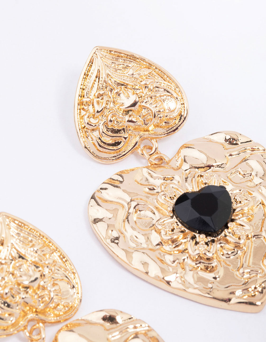 For an eye-catching addition to your stack, style these golden drop earrings. These unique statement earrings feature textured hearts adorned with black stones in the centre. Perfect for date night!
