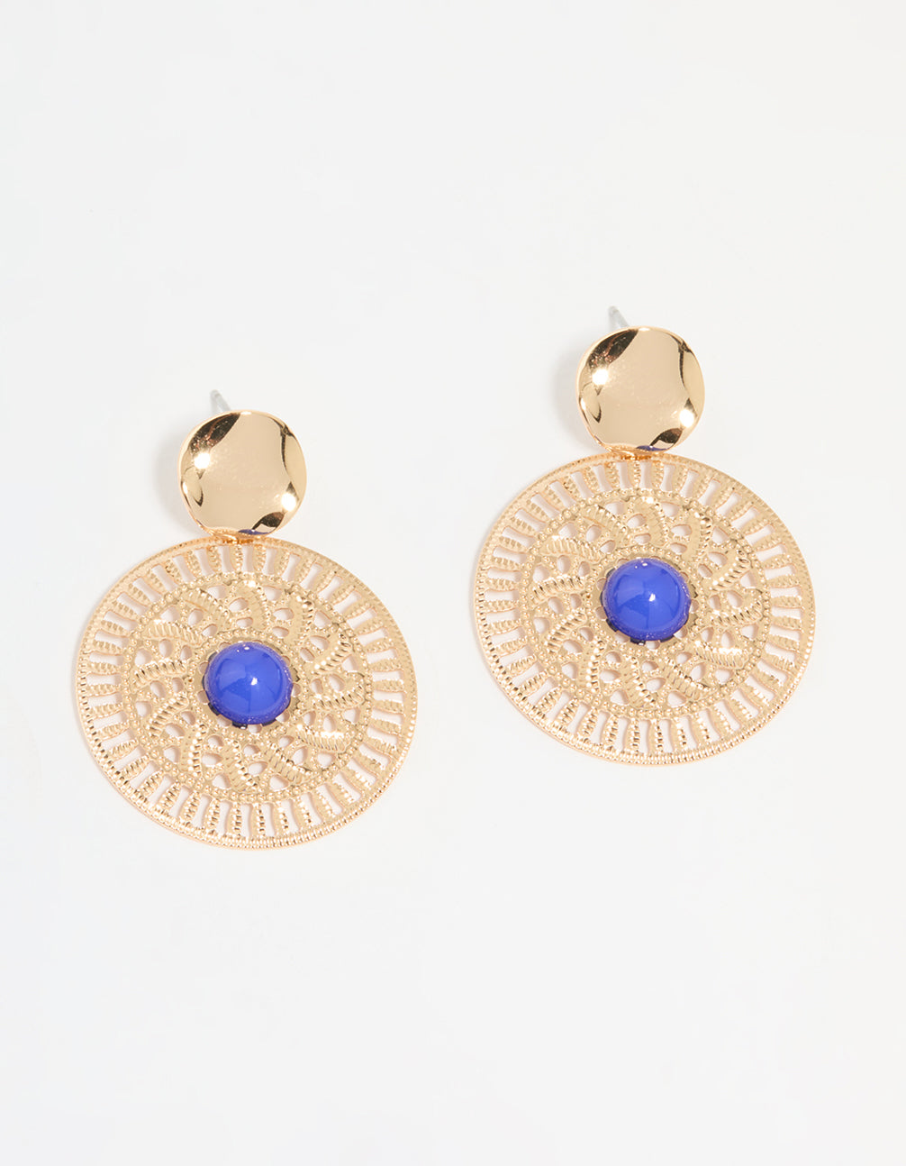 Elevate your accessory game with these Gold Filigree & Blue Marble Center Drop Earrings. These stylish drop earrings feature intricate gold filigree detailing that perfectly frames a striking blue marble-effect centre, blending sophistication with a touch of bold colour. Whether you're dressing up for a wedding, heading to brunch, or adding flair to your everyday look, these earrings are an ideal choice. Their lightweight design makes them comfy for all-day wear, while the elegant filigree style adds timeless charm. Pair them with a flowing maxi dress for boho vibes or a tailored blazer to make a statement.