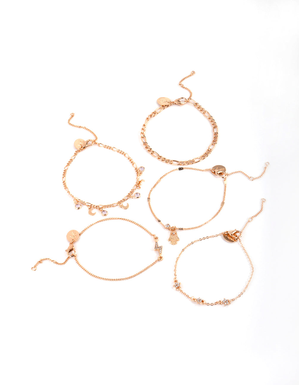 Gold-toned chains are classic pieces which can easily be dressed up or down. This pack includes four chains which can be worn as bracelets or anklets. They boast a variety of designs: motifs nclude moons, stars, lightning bolts and the hamsa hand. Layer these together for maximum impact.