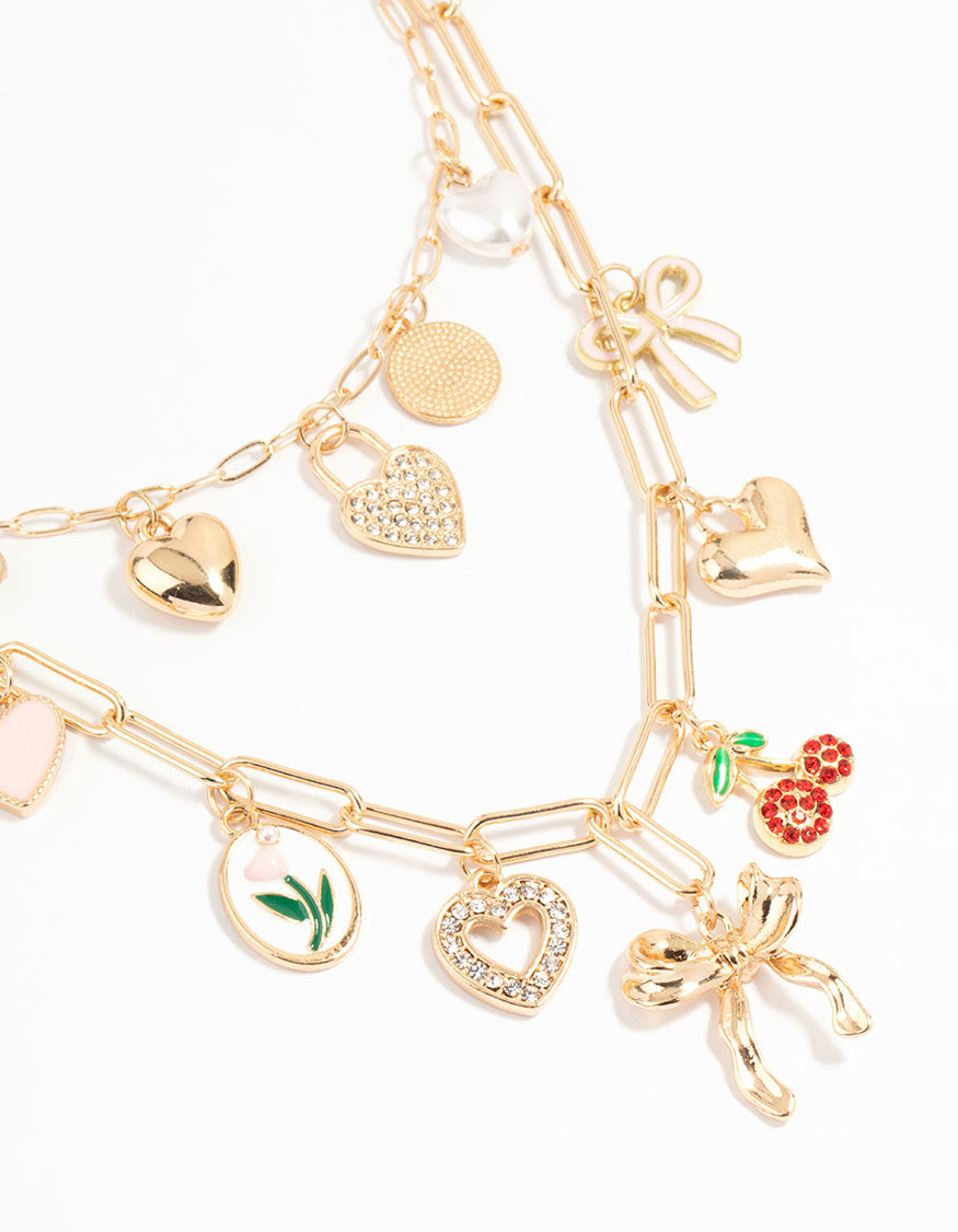 Bring the love this Valentine's Day with heart and bow motifs. This stunning gold-toned charm necklace features charms including diamante hearts, cheeky cherries, colorful hearts, and pretty bows.