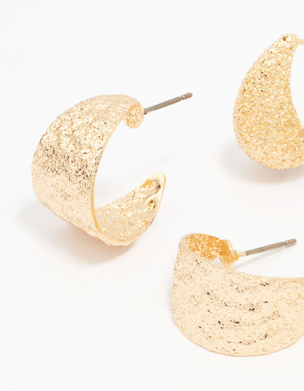 For a timeless addition to your look, style these gorgeous gold-toned earrings. This earring pack contains a pair of bold textured hoops and adorning teardrop earrings, perfect for mixing up your stack!