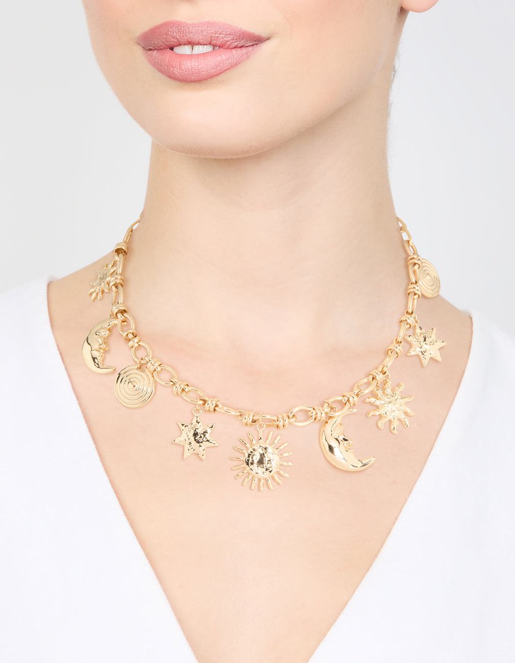 Shine like the star you are with this Gold Molten Celestial Charm Necklace! This dreamy piece of jewellery is all about cosmic vibes, featuring celestial-inspired charms in a molten gold finish. Perfect for layering with your favourite necklaces or wearing solo as a standout piece, this gold-tone accessory adds a touch of magic to any look. Pair it with a floaty dress for a boho feel, or wear it with jeans and a tee to elevate your everyday style. Ideal for day-to-night transitions, this necklace is your go-to for everything from brunch dates to moonlit evenings.