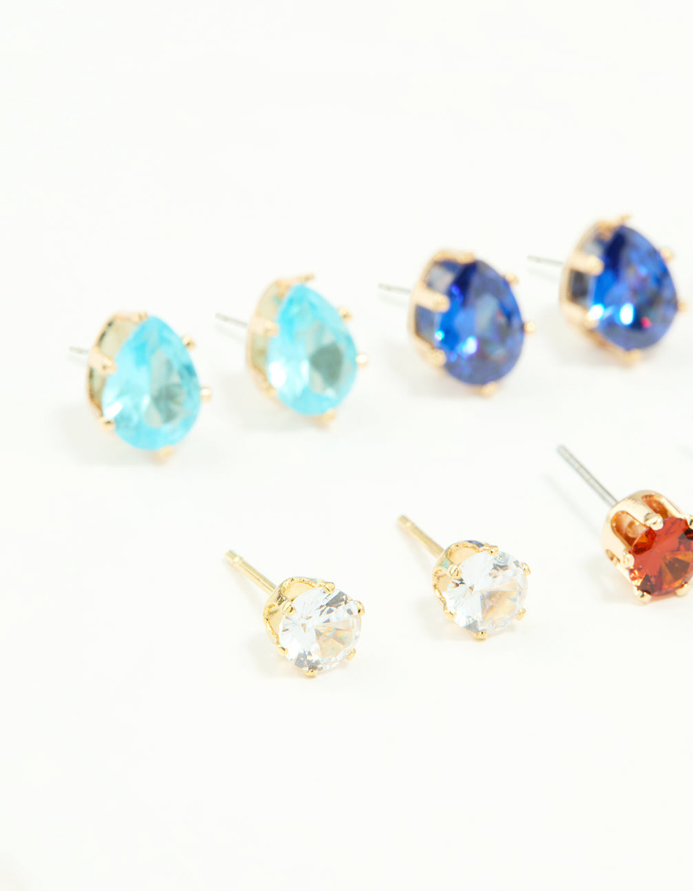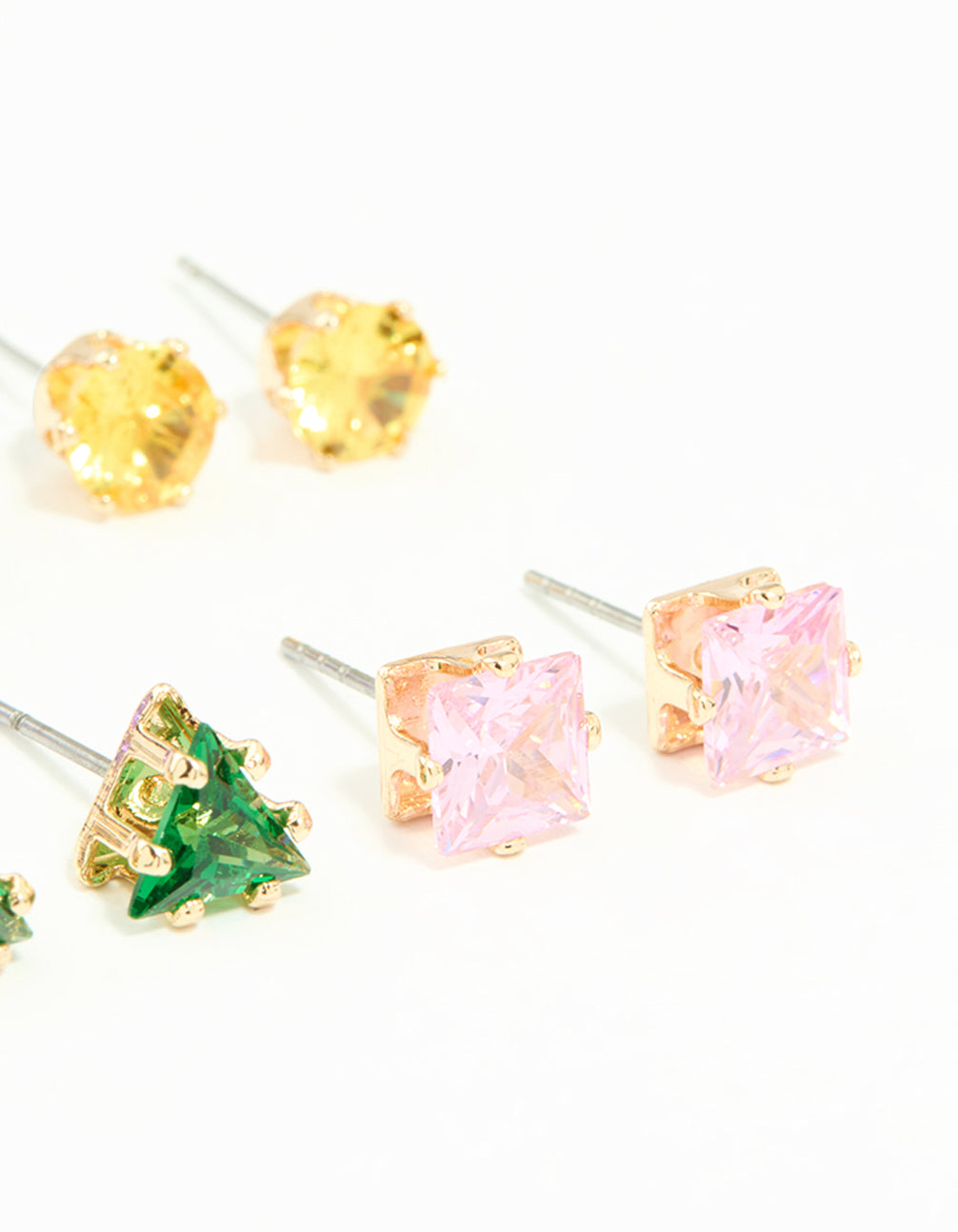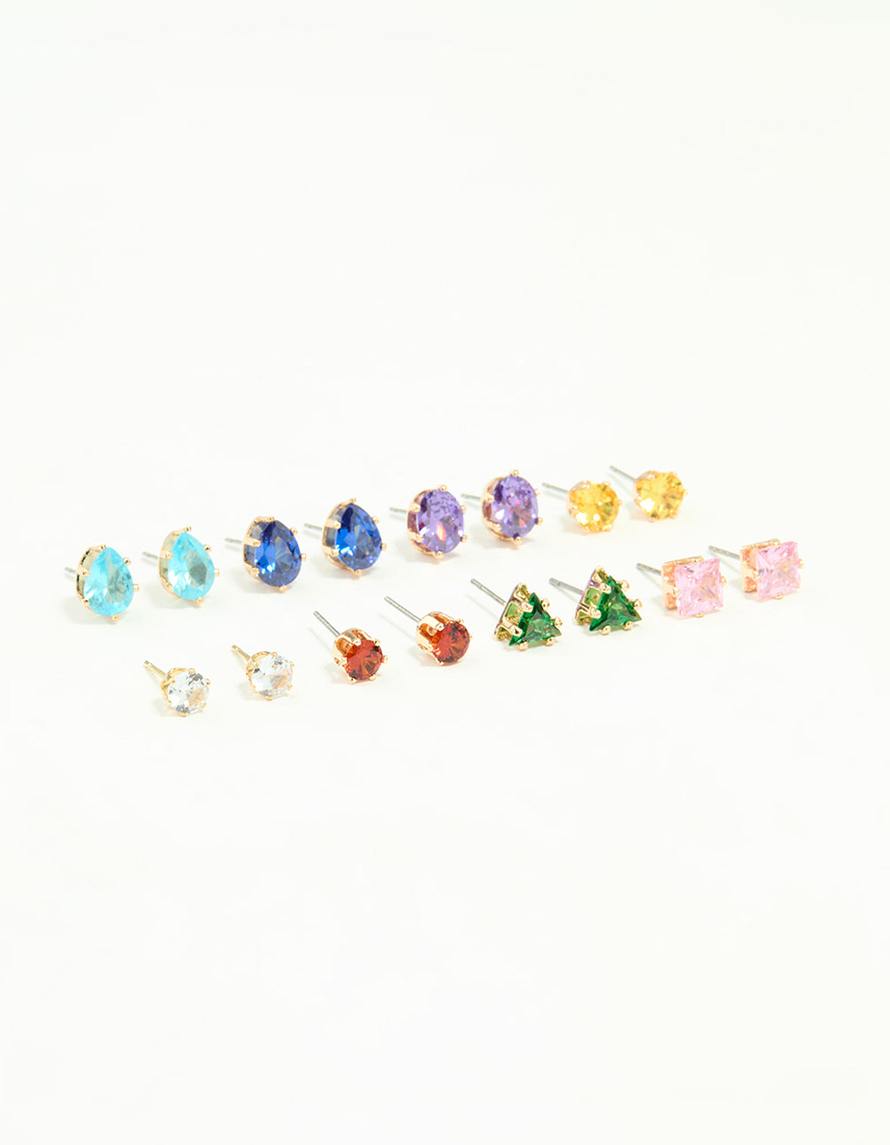 Brighten up your jewellery collection with this Gold Multicoloured Diamante Mixed Shape Stud Earrings Pack! This stunning set of stud earrings offers a kaleidoscope of colours and shapes, from teardrop-shaped light blue and dark blue diamantes to light purple, orange, red, and pink square diamantes. Featuring green triangle studs and classic clear diamantes, each pair is designed to add a pop of personality to your look. Perfect for mixing, matching, and stacking, these earrings are a versatile accessory for any occasion. Whether you're dressing up for a party, heading out for brunch, or adding fun to your casual outfits, these gold-toned beauties are your go-to. Pair them with flowy dresses, denim jackets, or even a sleek blazer for a playful yet polished vibe. With this pack, you'll always have the perfect earrings to match your mood!