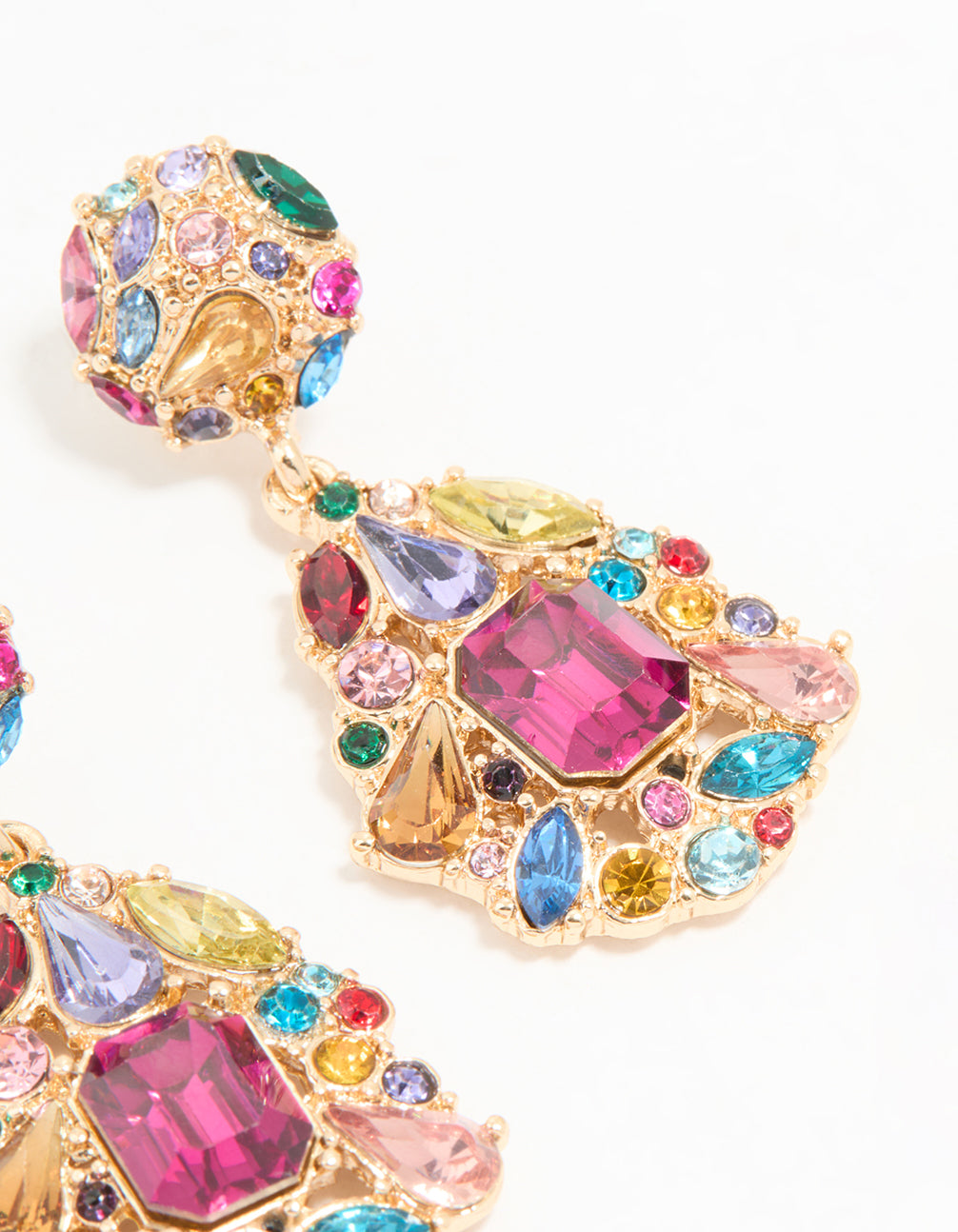Gold Multicoloured Diamante Teardrop Drop Earrings