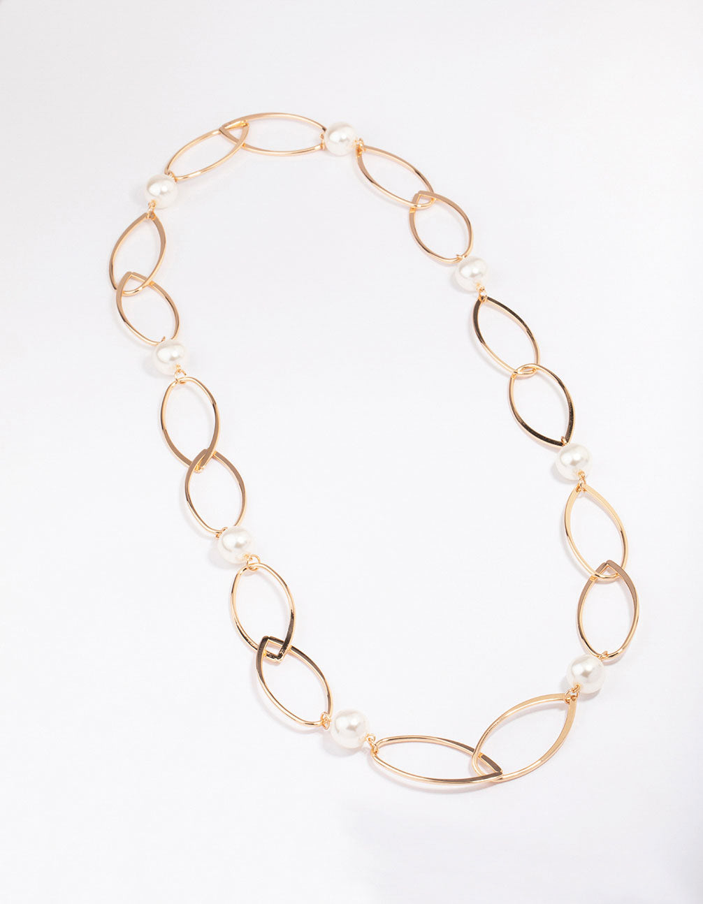 Add dimension to your look with this unique, gold-toned necklace. This chain necklace features a collection of interlocking oval-shaped chains, dotted with pearls for a refined finish.