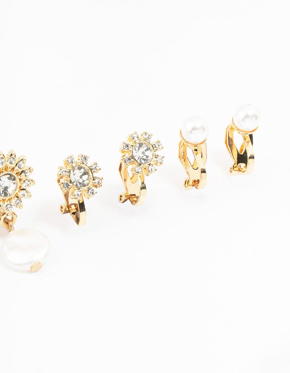 Elevate your ear game with stacked earrings for a personalized look. These glamorous gold-tone clip-on earrings dazzle with pearls and shimmering diamante stones, making a bold statement. The secure clip-on closure ensures comfort while adding style.
