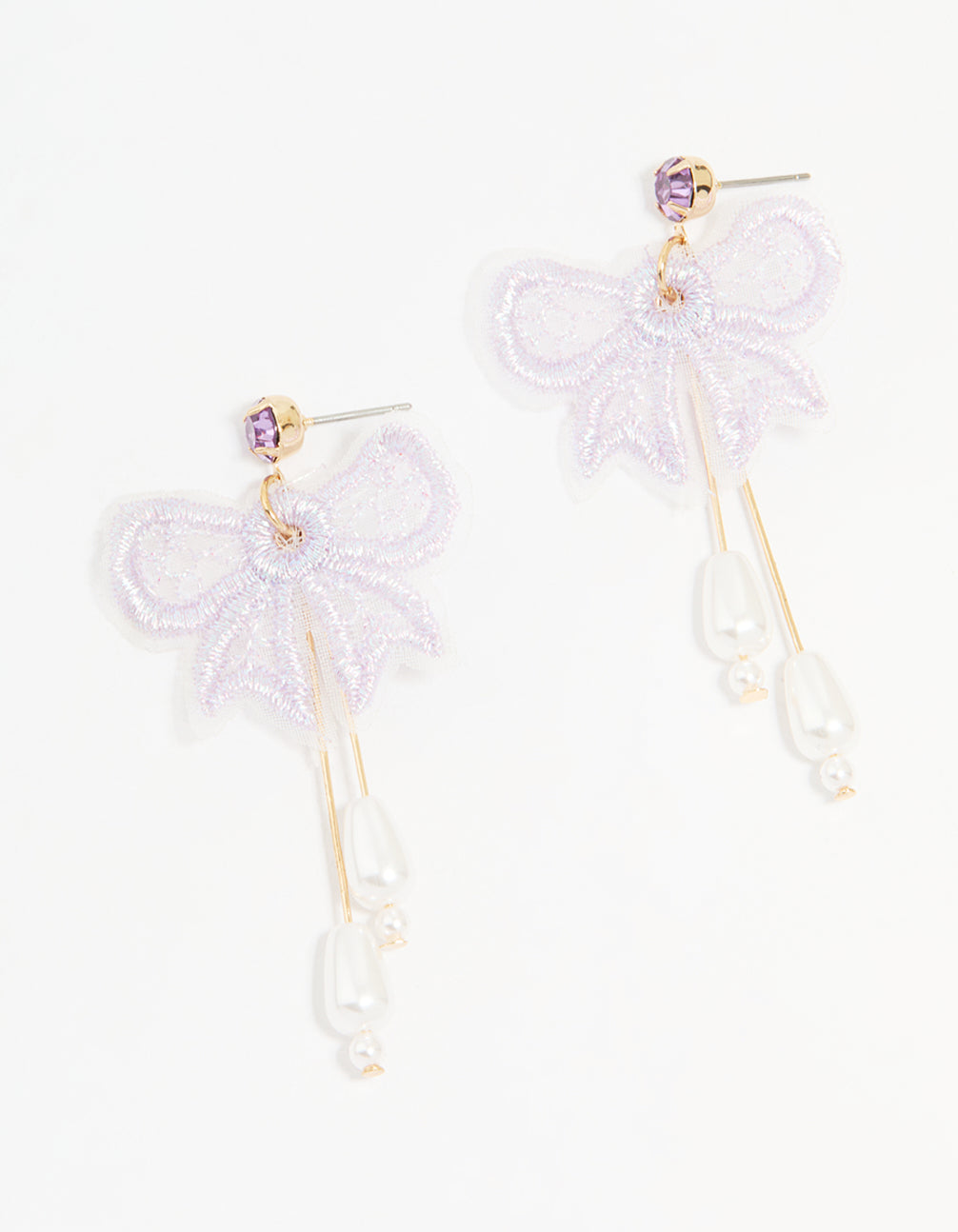Add a touch of elegance with these Gold Pearl Mesh Bow Drop Earrings. Featuring a delicate purple mesh bow and timeless pearl drops, these earrings are a gorgeous choice for special occasions or dressing up a casual look. Their graceful drop design makes them ideal for pairing with flowy dresses, tailored blouses, or even a chic jumpsuit. Whether you're heading to a party, a dinner date, or simply want to elevate your everyday outfit, these earrings are versatile enough for all. A must-have for anyone who loves standout accessories, they make a fabulous gift or a treat for yourself!