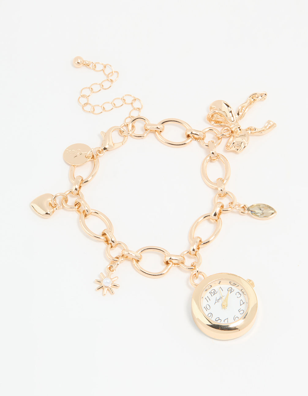 Stay on time and on trend with this Gold Pearl Star & Watch Charm Bracelet ! This gorgeous bracelet is adorned with a playful mix of charms—a coquettish bow, a teardrop-shaped diamante, a heart, a pearl star, and, of course, a chic functional watch charm. Perfect for adding a touch of elegance to your everyday look or spicing up an evening ensemble, this charm bracelet watch effortlessly combines style and practicality. Wear it solo for a subtle statement or stack it with bangles for a layered effect. Whether you're heading to brunch or a night out, this piece is your perfect timing companion.