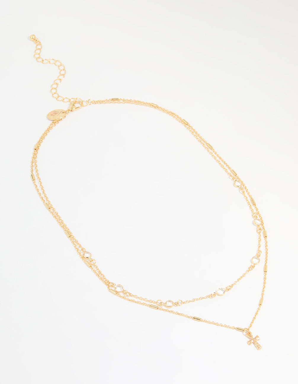 Gold Plated Bezel Chain & Cross Layered Necklace