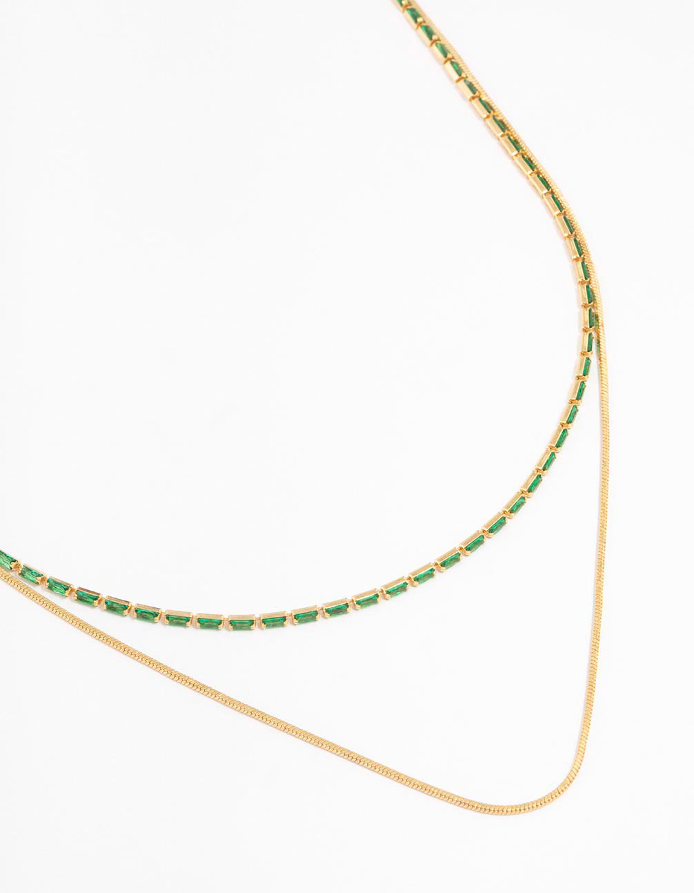 Gold Plated Cubic Zirconia Emerald Baguette Dainty Layered Necklace