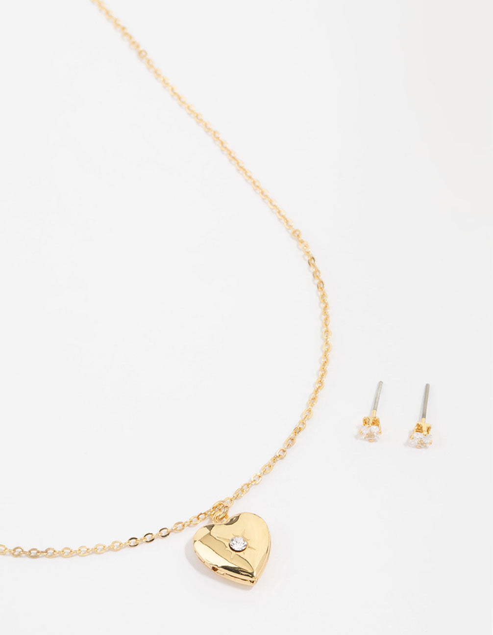 Gold Plated Cubic Zirconia Heart Locket Necklace & Stud Earrings Set