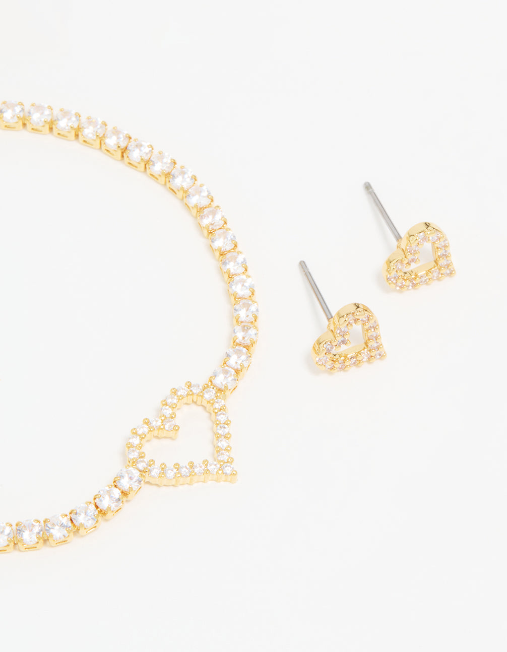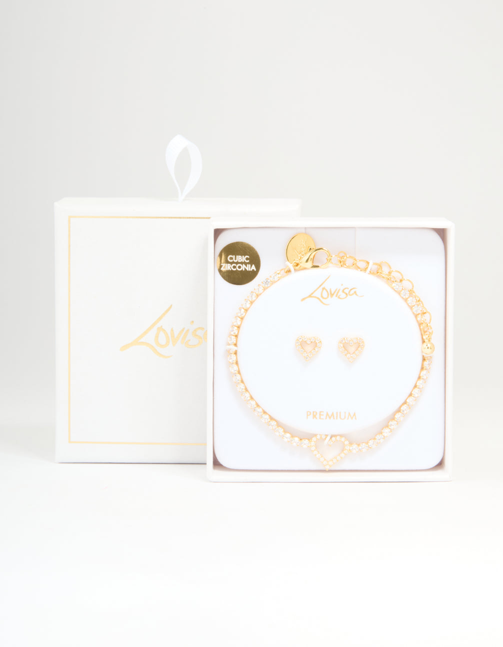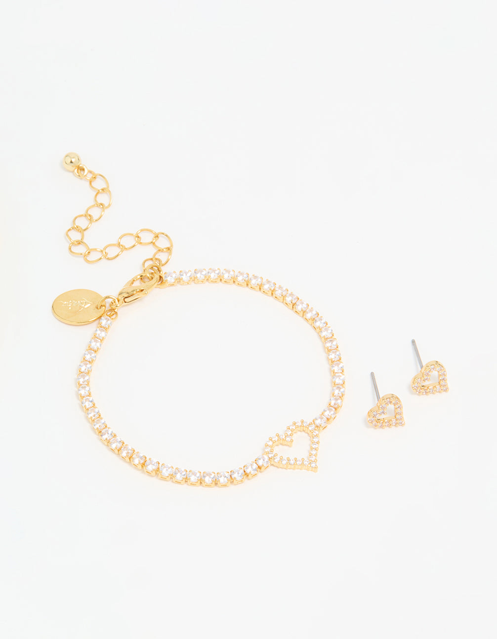 Gold Plated Cubic Zirconia Heart Outline Tennis Bracelet & Earrings Set