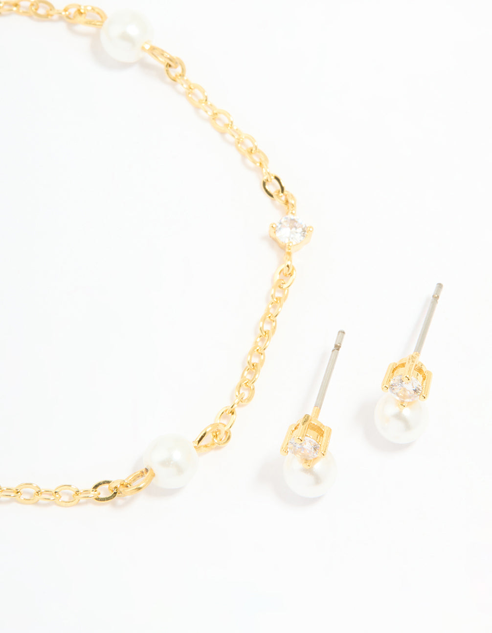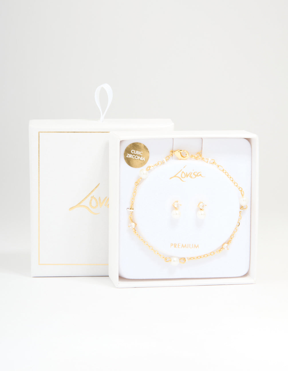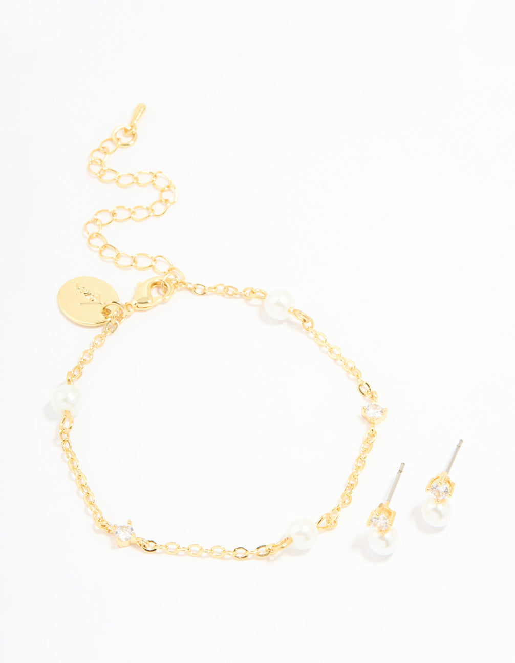 Gold Plated Cubic Zirconia Pearl Bracelet & Earrings Set