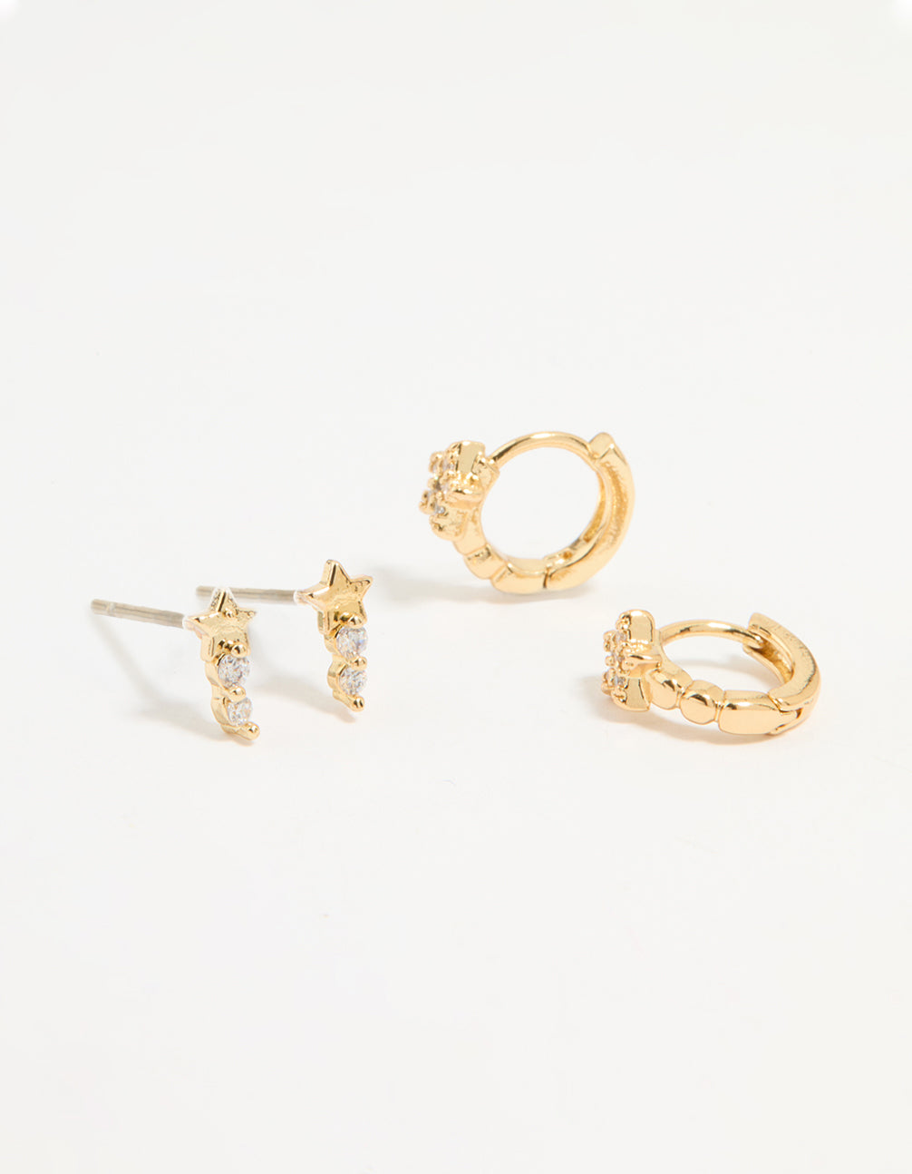 Gold Plated Cubic Zirconia Star Stud & Huggie Earrings 2-Pack