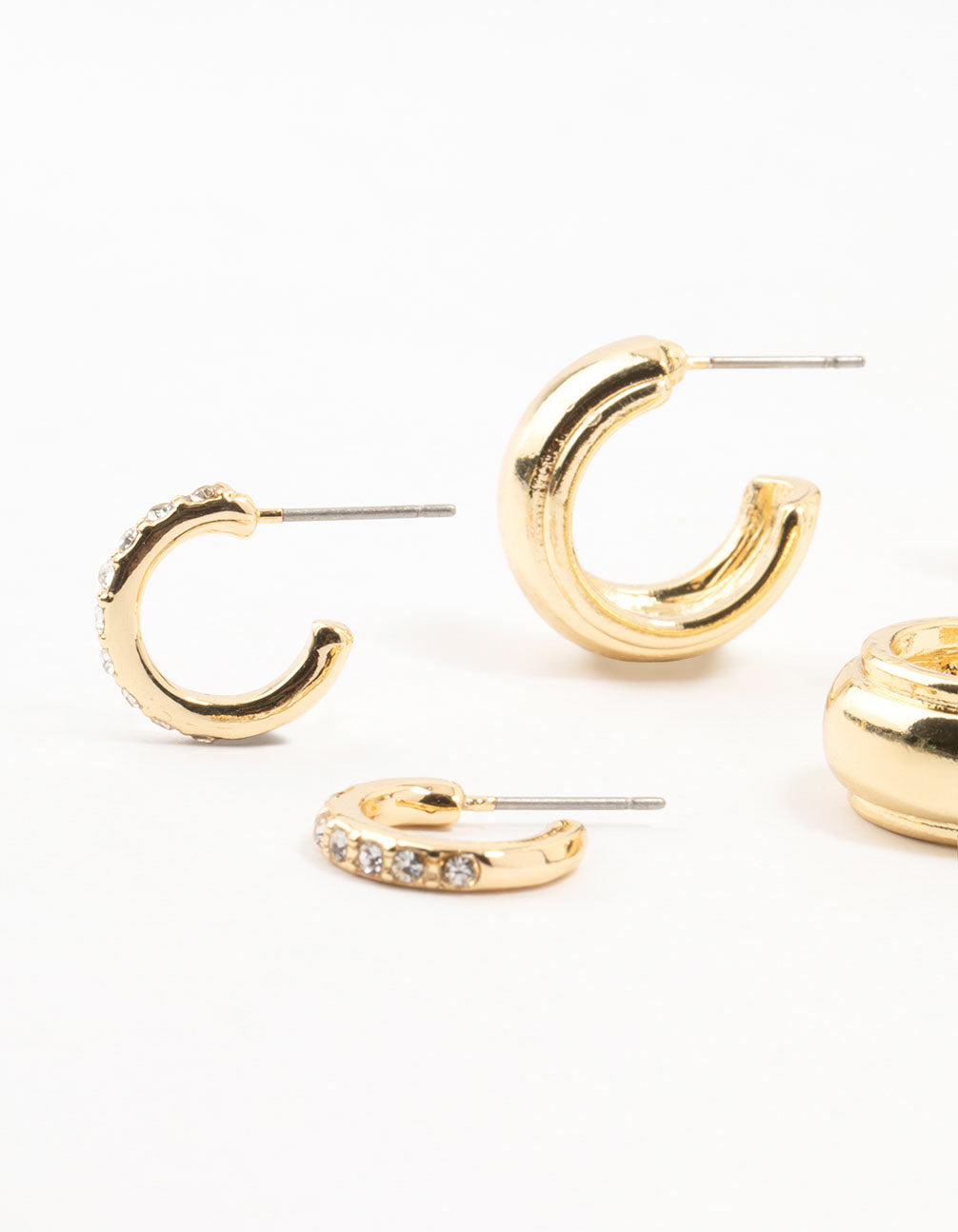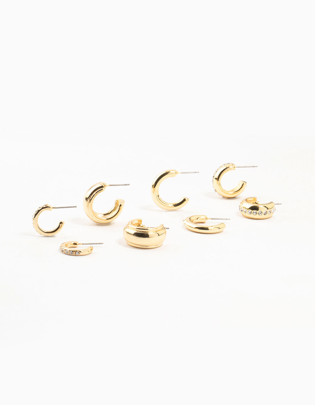 Upgrade your everyday look with this set of four dazzling diamante hoop earrings. These gold plated chunky hoops lend an effortlessly chic vibe. These sparkling statement-making earrings will have you shining bright.