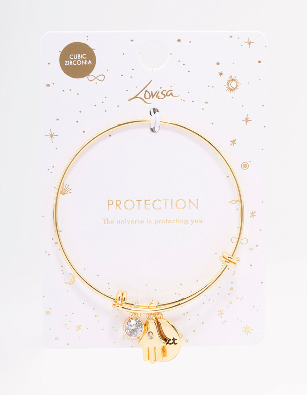 This bangle features three charms, including a coin with the word 'protect' written in script.