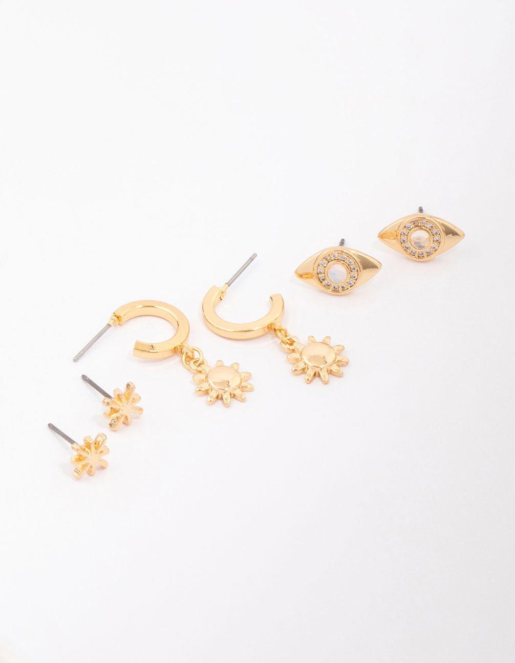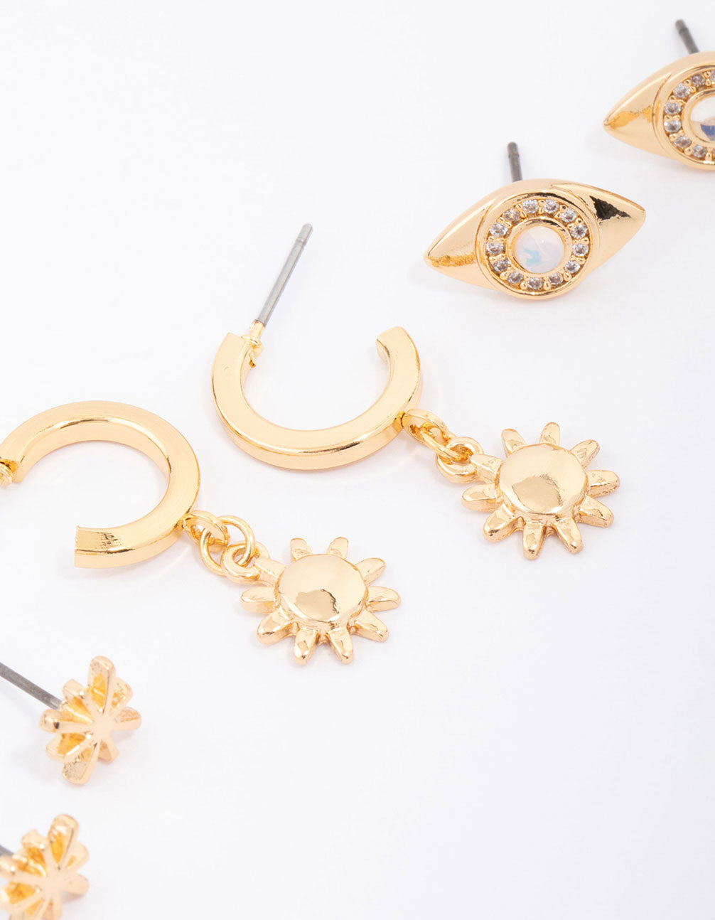 This earring pack contains a mix of sun and evil eye motifs, adorned with cubic zirconia crystals for a hint of sparkle.