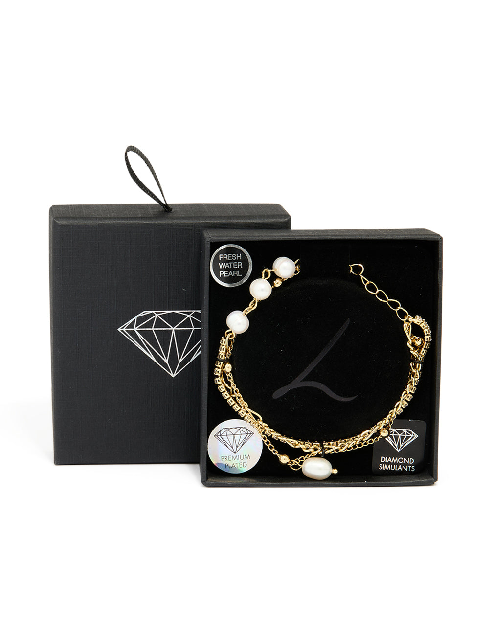 Gold Plated Freshwater Pearl Diamante Layered Chain Bracelet