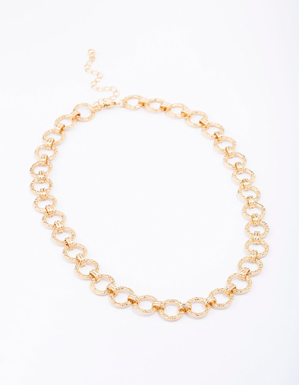 This gold plated necklace features a hammered link chain for a unique finish to your outfit.