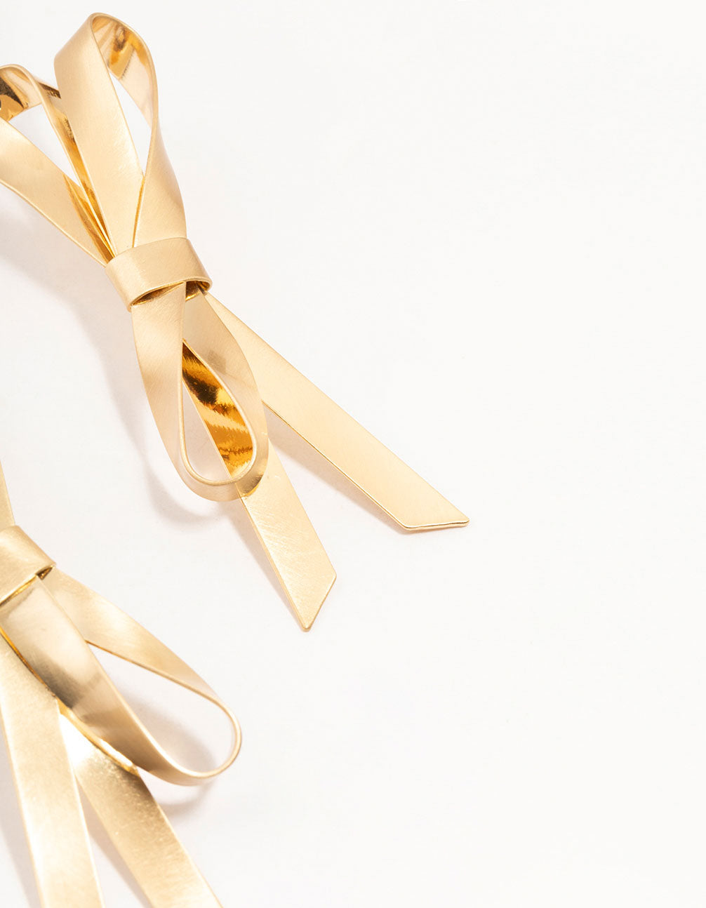 These stunning drop earrings feature a large gold plated bow design with dangling drop accents.