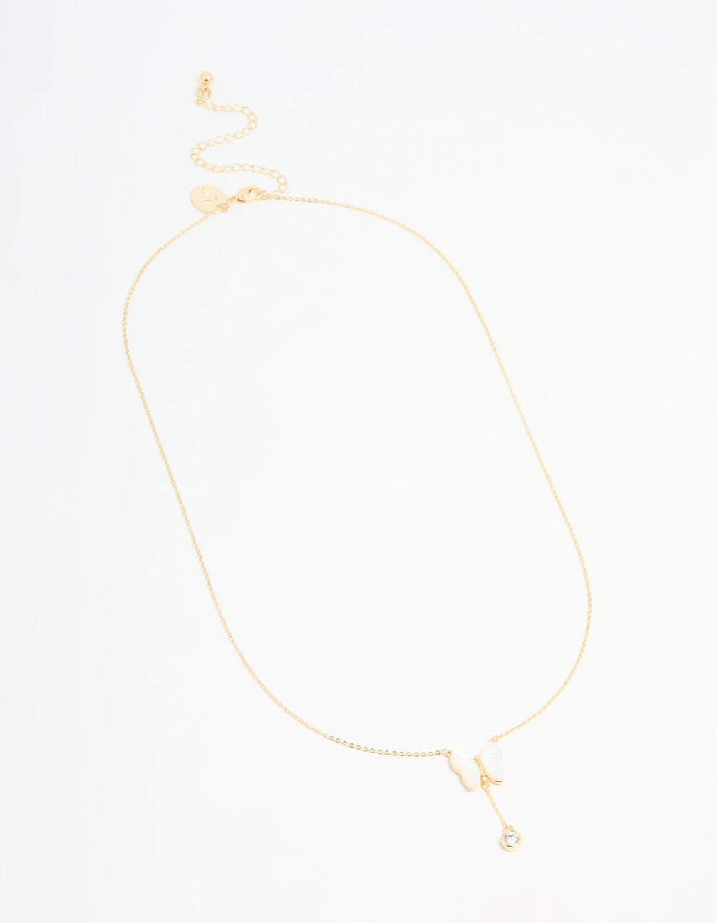 Upgrade your style with our Gold Plated Mother Of Pearl & Cubic Zirconia Butterfly Y-Necklace! This elegant necklace features a gold-plated chain with shimmering cubic zirconia drop and mother of pearl butterfly pendant.