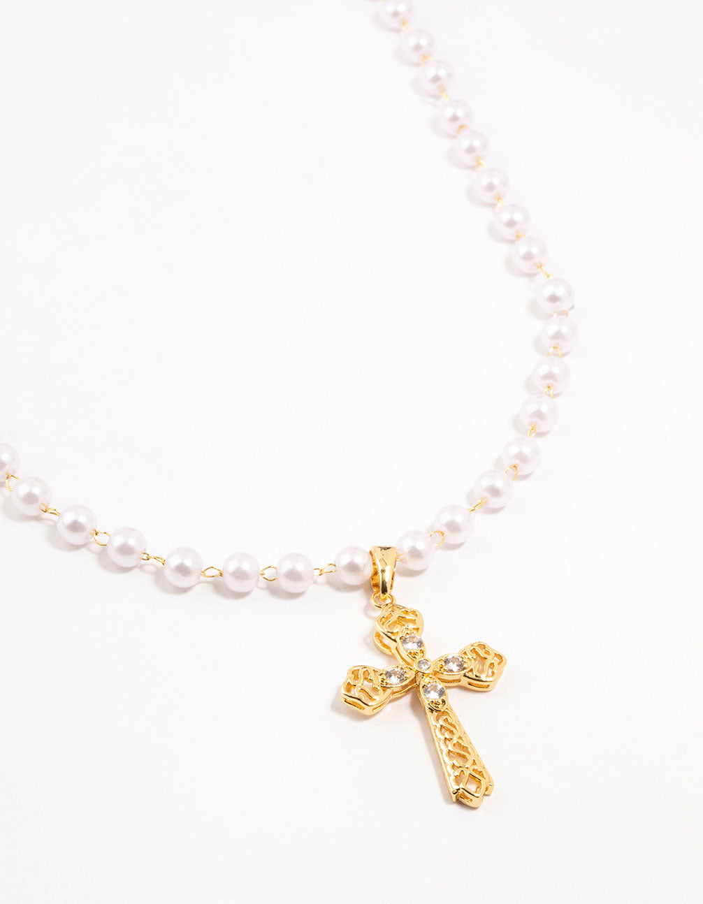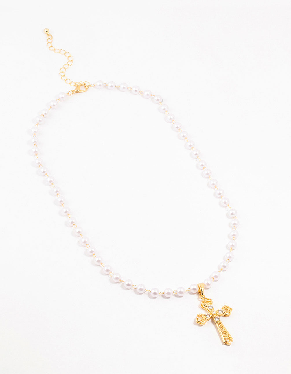 Add instant glamour with this stunning necklace. Featuring a gold-plated base, a sparkly baroque-style cross, and pearls, it's perfect for adding elegance to any look.
