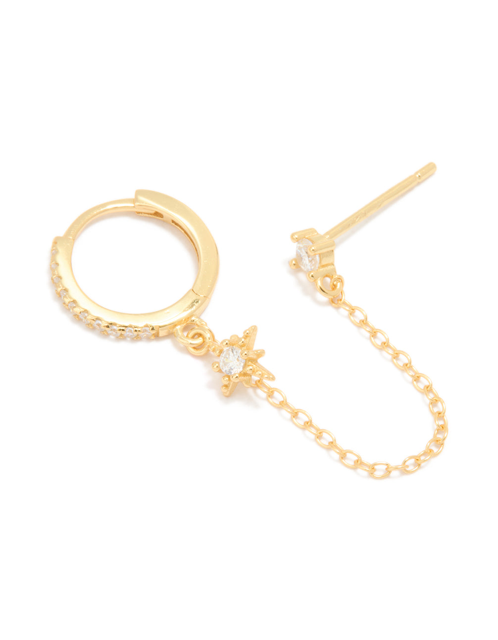 Add a little sparkle to your look with this Gold Plated Sterling Silver Cubic Zirconia Chain Double Earring. This stylish double earring is the perfect mix of edgy and elegant. This double earrings features a delicate huggie with a cubic zirconia star design and a classic cubic zirconia stud with a chic chain detail. Crafted from sterling silver and plated in gold, this earring is lightweight and versatile, perfect for an effortlessly cool ear-stacked look.