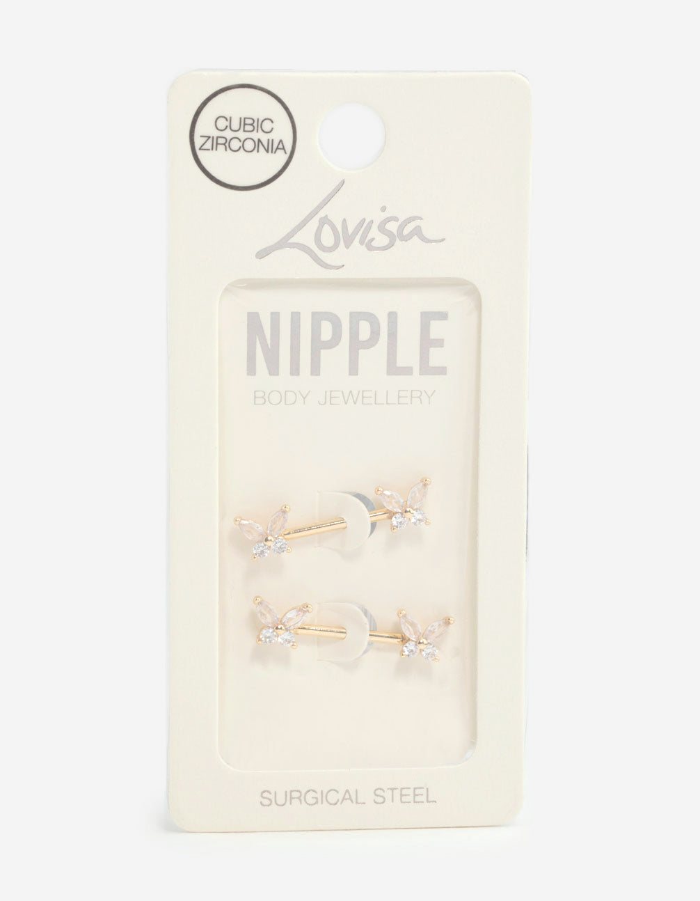 Add sparkle to your style with this set of two nipple bars. This set features two gold-plated surgical steel cubic zirconia butterfly nipple bars. This set is hypoallergenic, perfect for everyday wear and playful under any outfit.