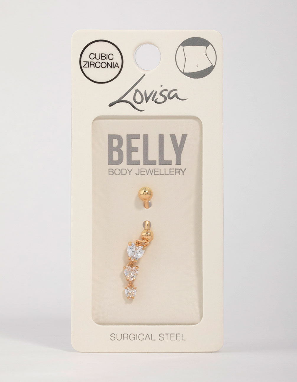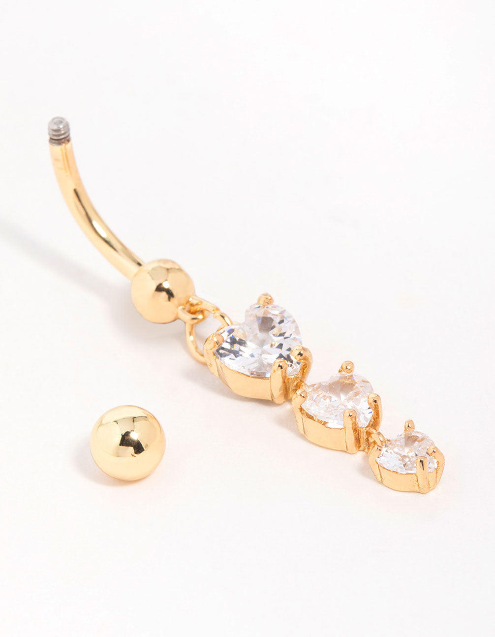 Turn heads with this Gold Plated Surgical Steel Cubic Zirconia Triple Heart Belly Bar. Made from durable surgical steel with gold plating, this piece combines style with comfort. The design showcases three sparkling heart-shaped cubic zirconia crystals, adding a touch of romance and glamour to your look. Perfect for showing off at festivals, beach days, or nights out, this belly jewellery works beautifully with cropped tops, bikinis, or high-waisted skirts for effortless style.