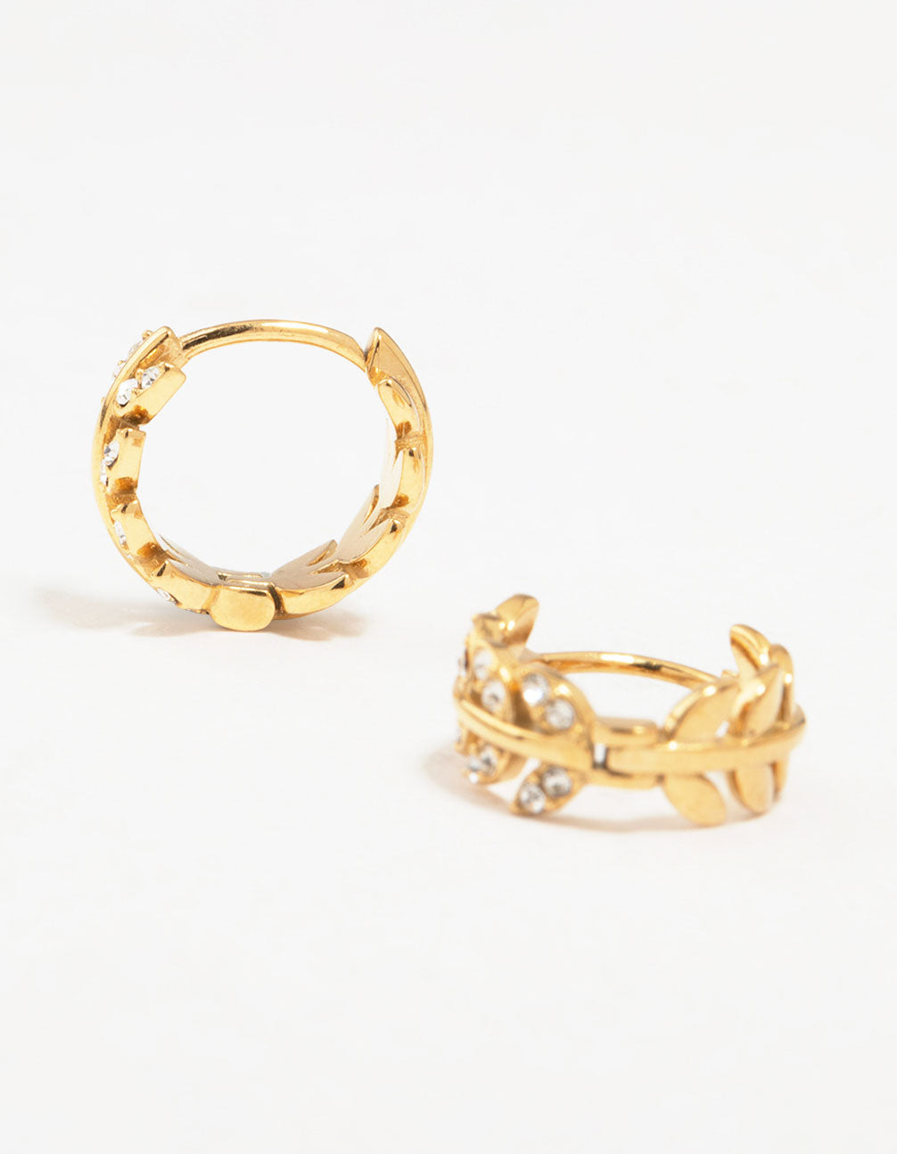 Add some fabulous style to your look with these huggie earrings! Crafted from gold-plated surgical steel for sensitive skin, they feature a cool diamante leaf design for an organic touch.