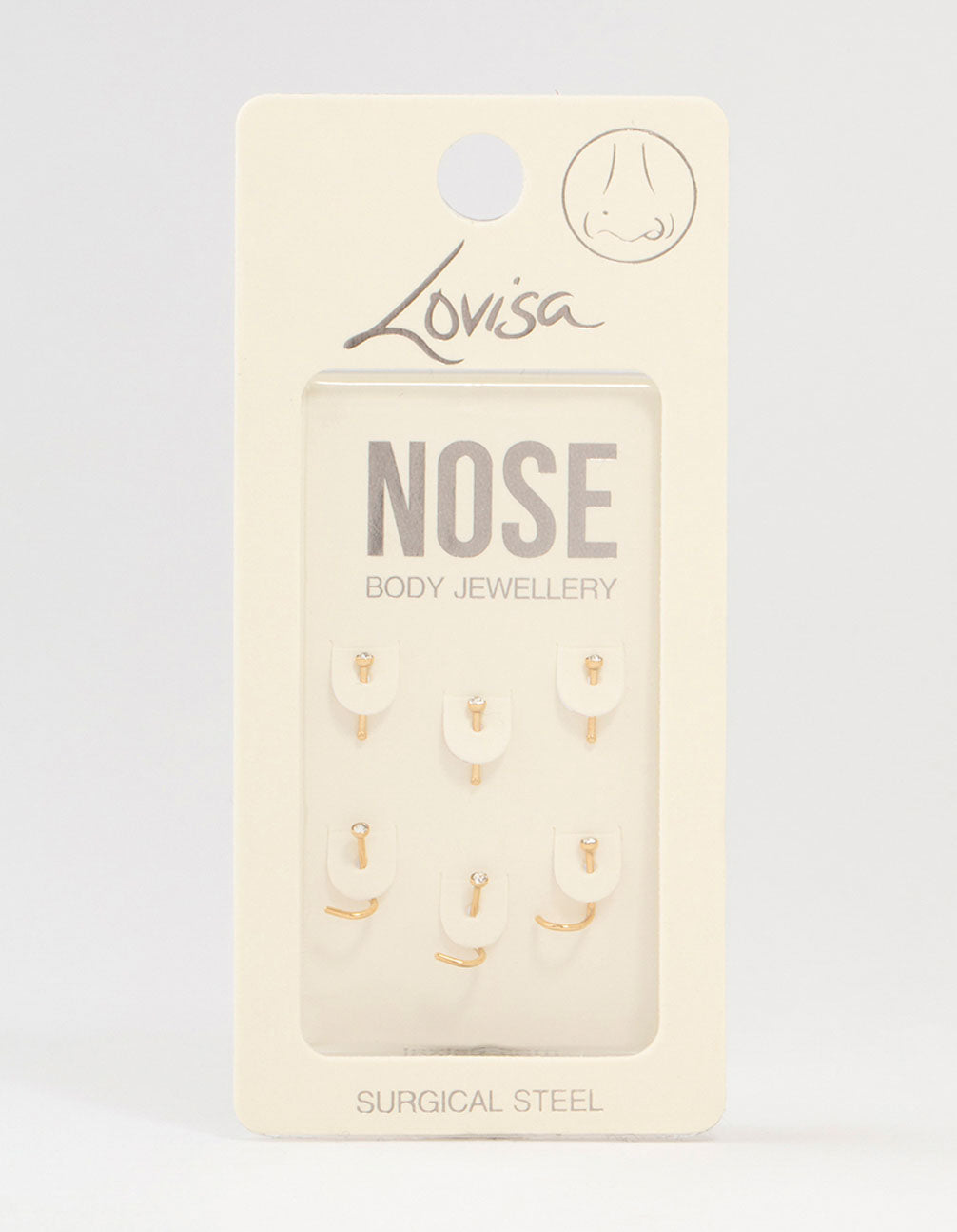 Be spoiled for choice with this fun set of six nose studs. Crafted using gold plated surgical steel for hypoallergenic wear and featuring sparkly diamante detailing. Perfect for changing up your nose piercing game.