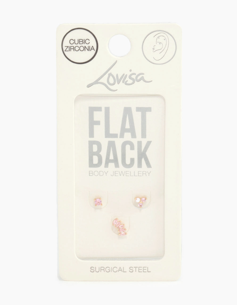 Glam it up with this comfy 3-pack of gold-plated surgical steel flat backs features pink cubic zirconia flowers, a fan, and a classic design. Perfect for sensitive skin, they add a luxurious shine to any outfit.