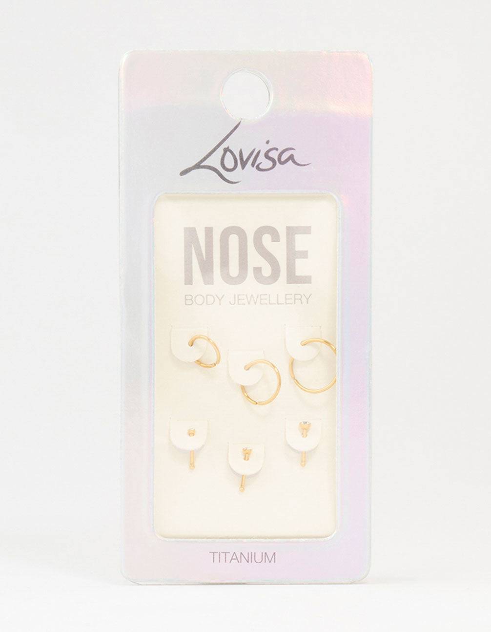 Glimmer with this 6-pack of gold-plated titanium nose rings and cubic zirconia studs. This stylish pack makes a simple statement. Mix and match these versatile nose piercings to create your own signature style - the possibilities are endless!