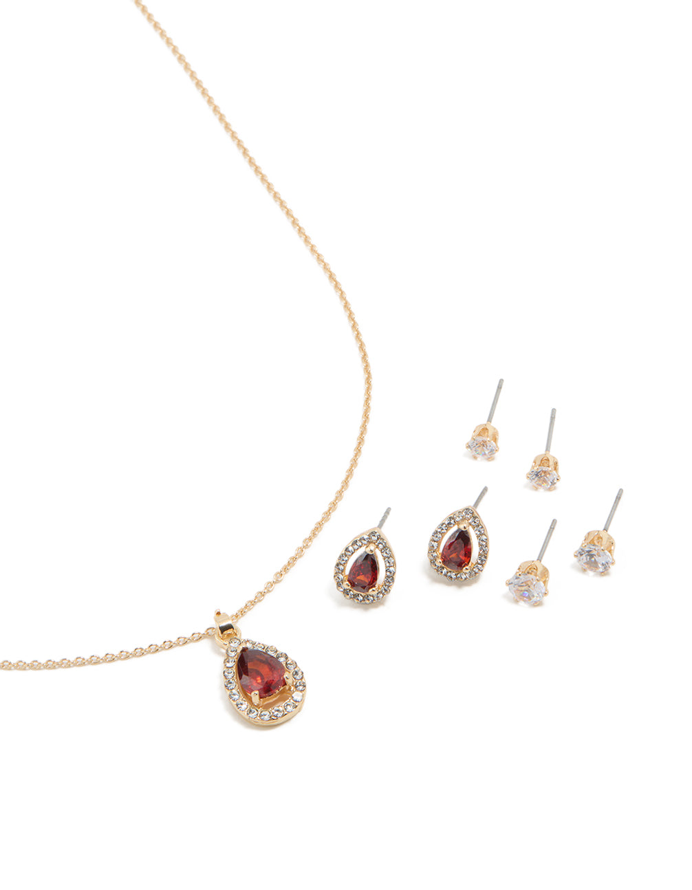 Gold Red Cubic Zirconia Halo Necklace & Earrings Set