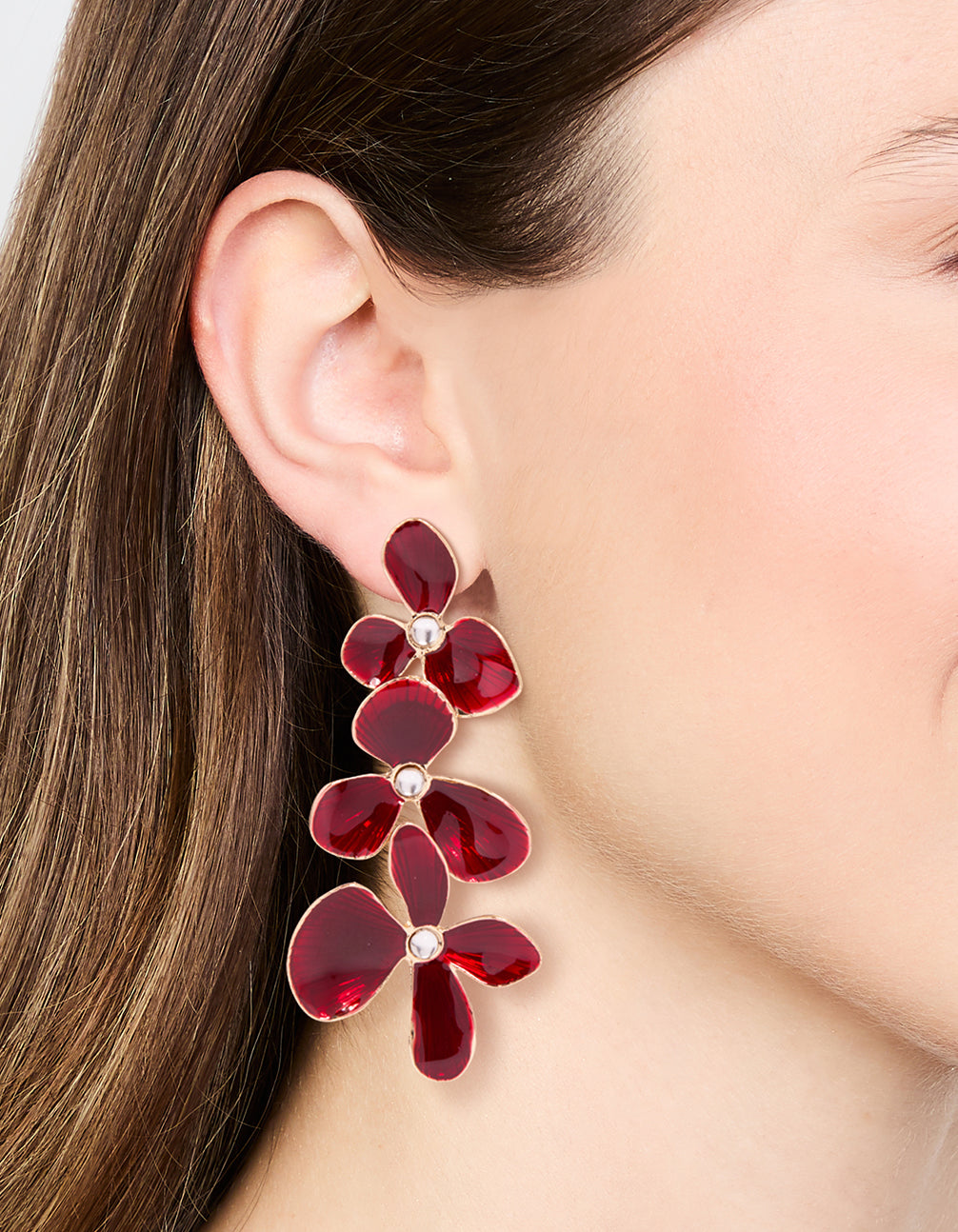 Add a bold pop of color with the Gold Red Enamel Triple Flower Drop Earrings! These stunning earrings feature vibrant red enamel flowers on a gold-toned base, perfect for any occasion.