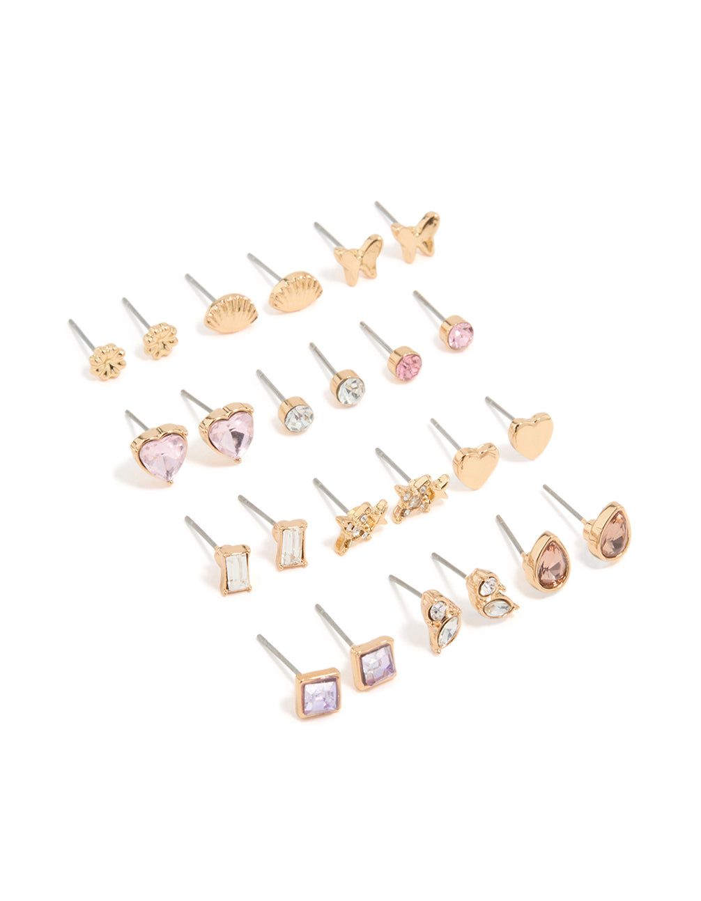 Elevate your accessory game with this Gold Shell & Heart Mixed Earrings Pack! Featuring 12 pairs of stunning stud earrings, this versatile collection includes delicate flower studs, ribbed shell designs, smooth butterfly shapes, and diamantes in heart, teardrop, and star shapes. With a mix of gold-toned finishes and playful pink, purple, and clear accents, these earrings are perfect for adding a touch of charm to any outfit. Whether you're dressing up for a special occasion or keeping it casual with jeans and a tee, this pack has a style for every mood. Ideal for layering multiple piercings or wearing solo, this collection is your go-to for effortless flair and everyday shimmer.
