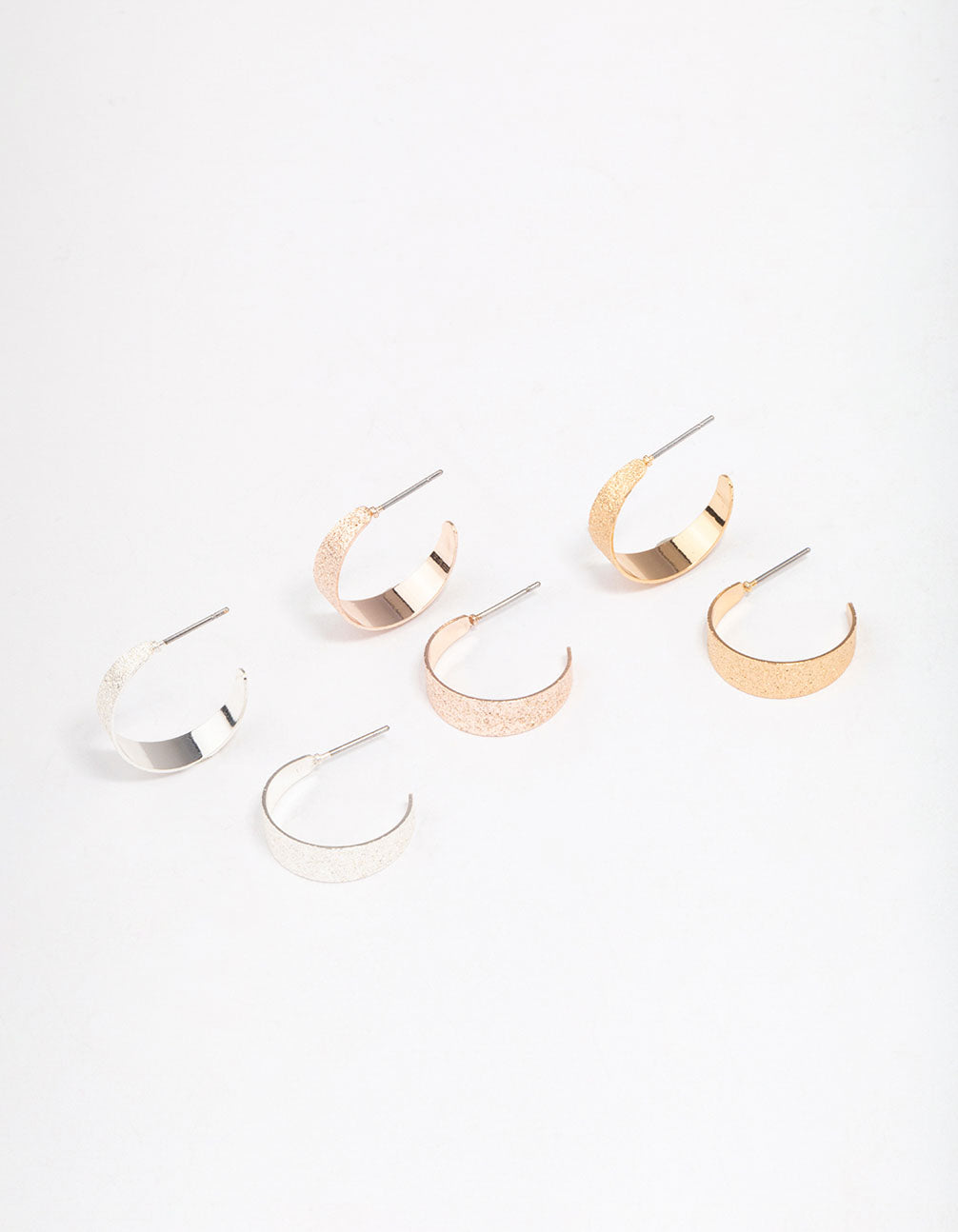 Curate the stack of your dreams with this pack of mixed hoop earrings. This earring pack includes three pairs of hoops in gold, silver and rose gold. Perfect for mixing your metals!