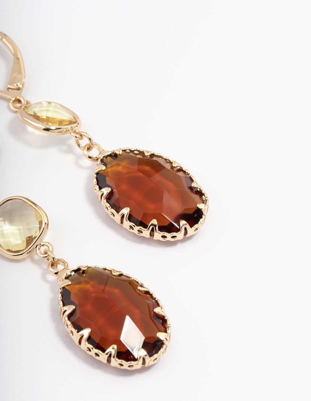 These stylish drop earrings feature an elegant mix of gold and amber stones in a unique square and oval design.