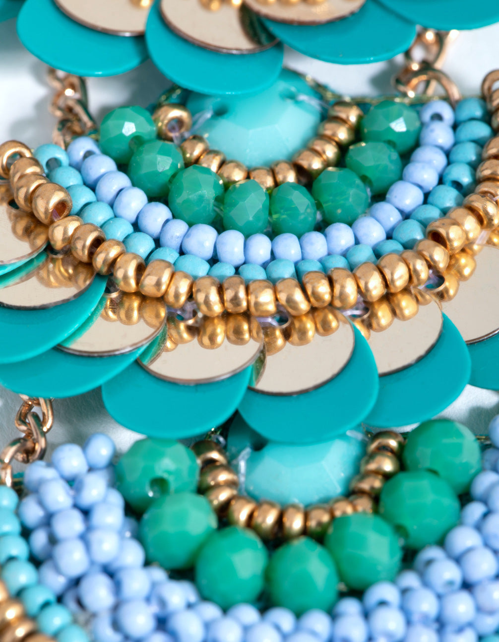 These stunning earrings are sure to turn heads! They feature three tired levels with a half-fan design. They're comprised of a mix of blue and green seed beads and sequins, with some gold-toned details to add a touch of luxe. Wear them with white for a luxury resort look, or pair them with colours for a bold look.