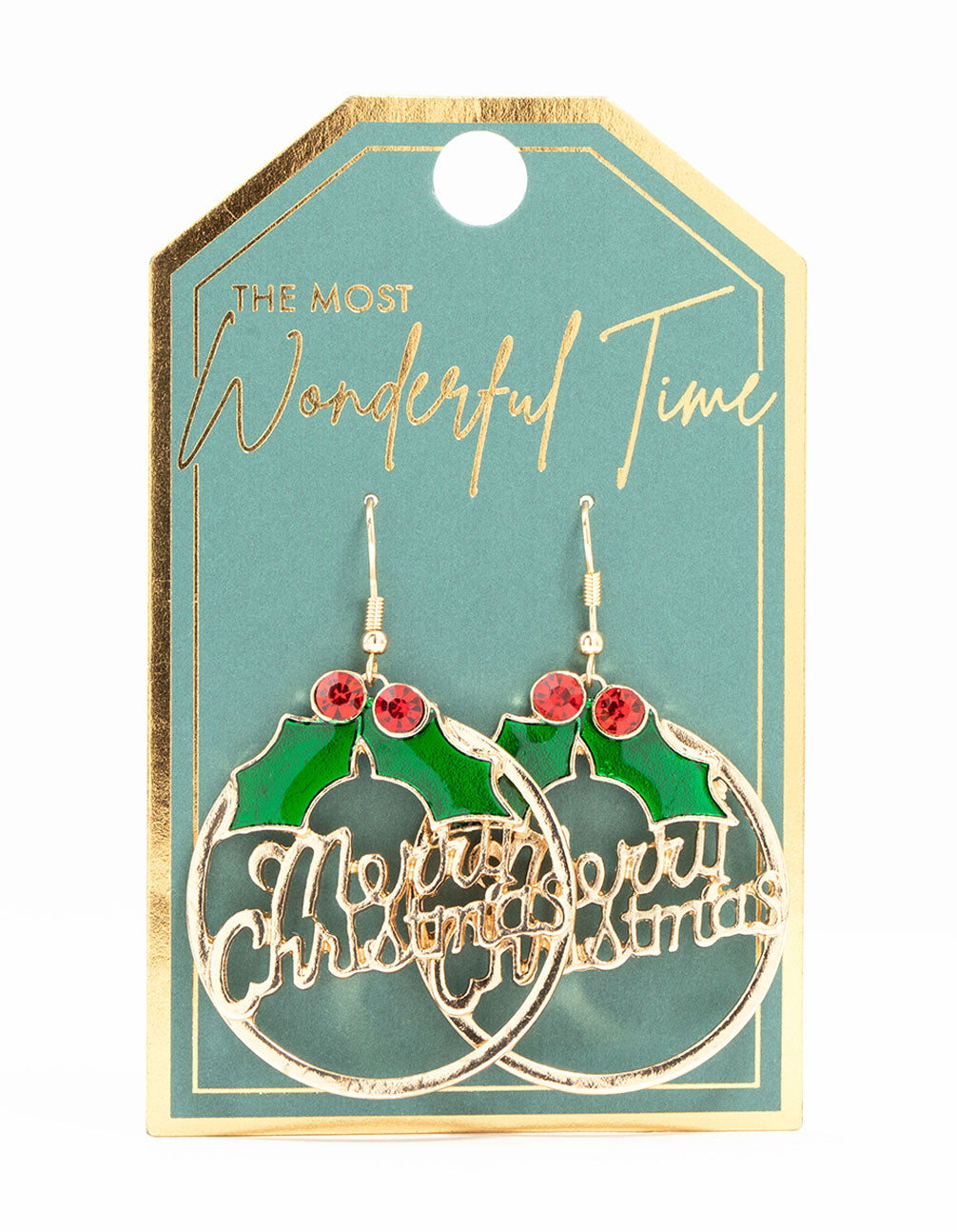 Gold Merry Christmas Wreath Hoop Drop Earrings