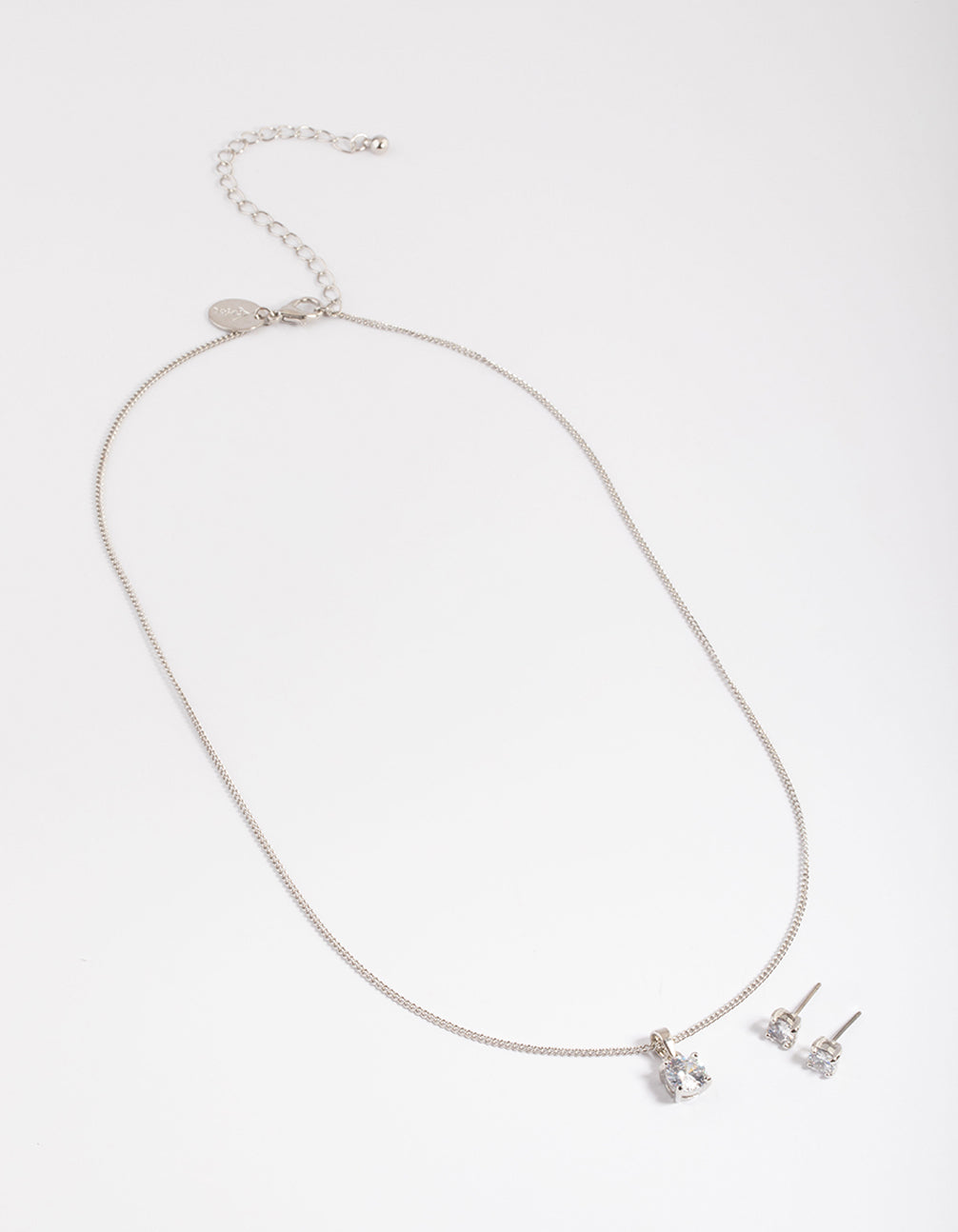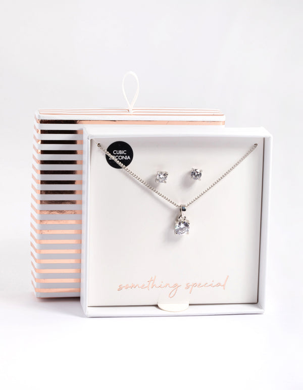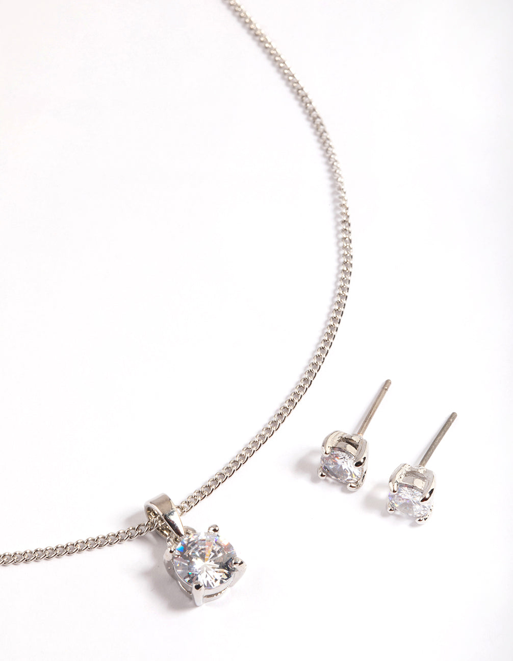 Silver Cubic Zirconia Solitaire Necklace & Stud Earrings