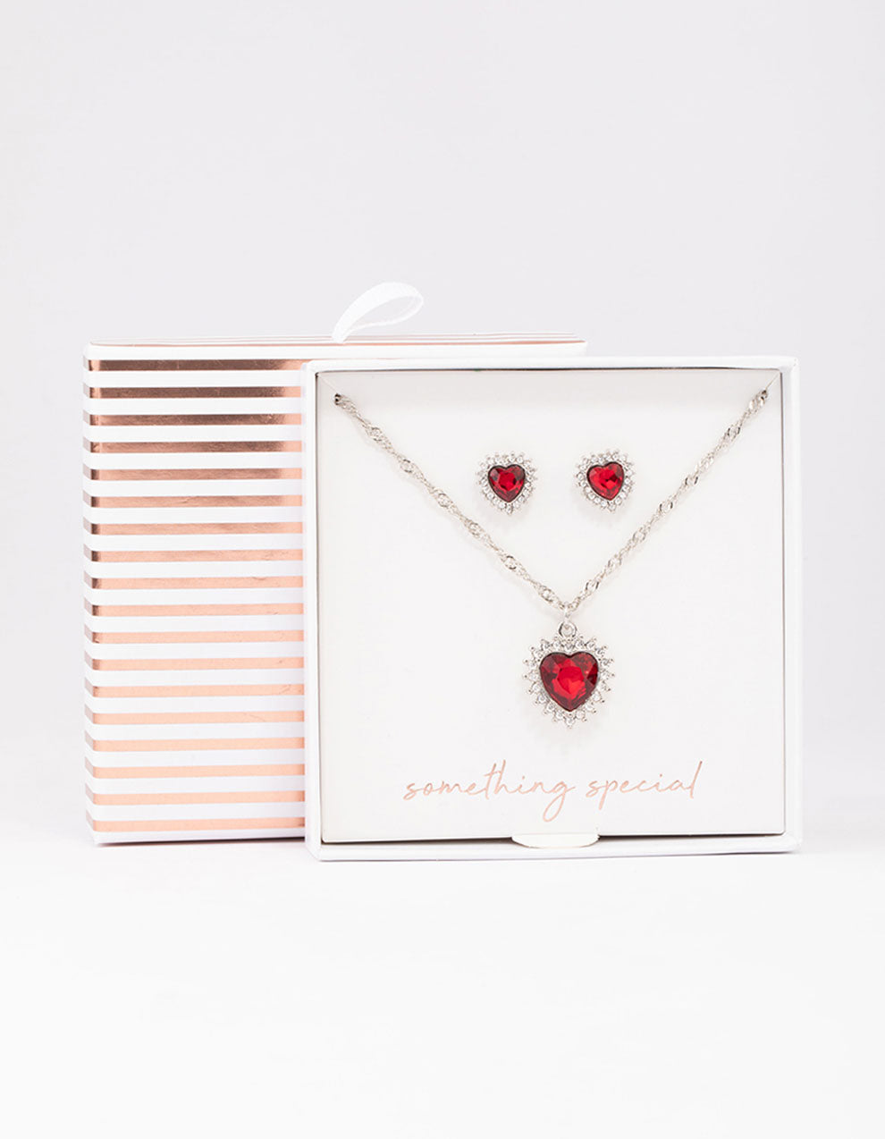 This gift box contains a set of stud earrings adorned with heart-shaped rubies and a simple pendant necklace to match.