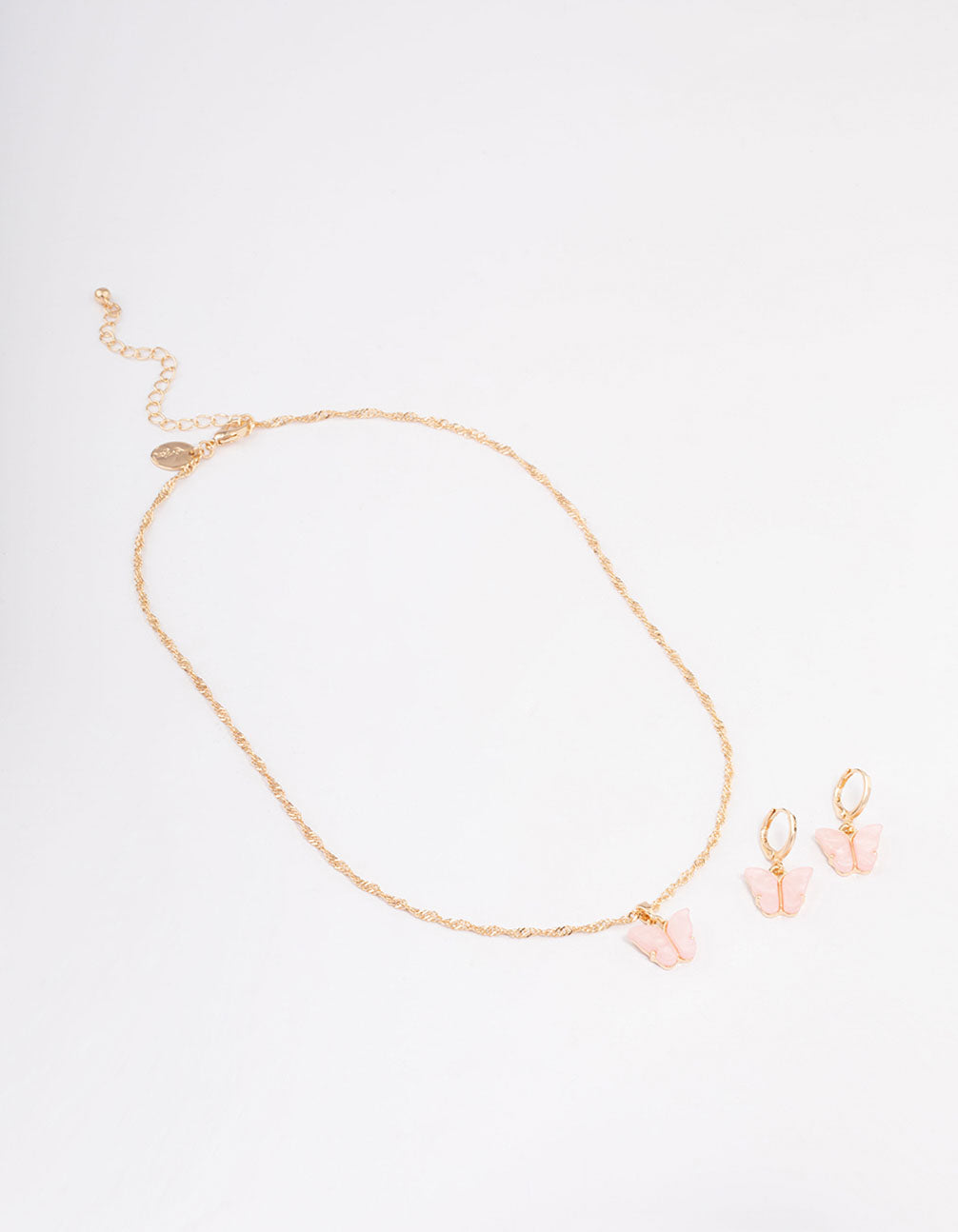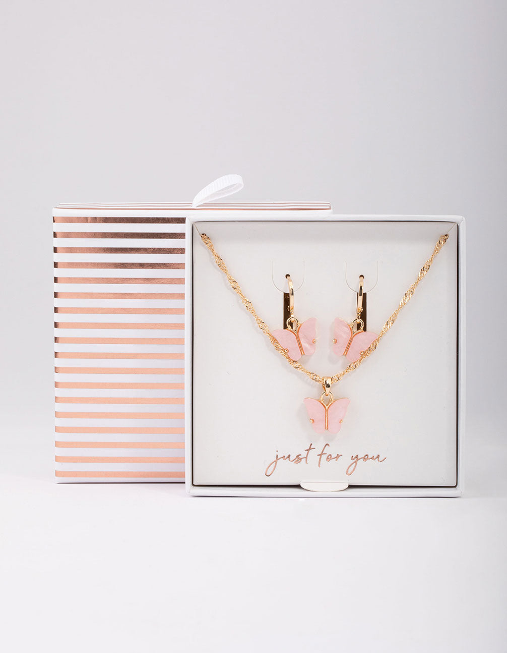 - Contents: This gift box contains a pair of butterfly drop earrings and matching pendant necklace.